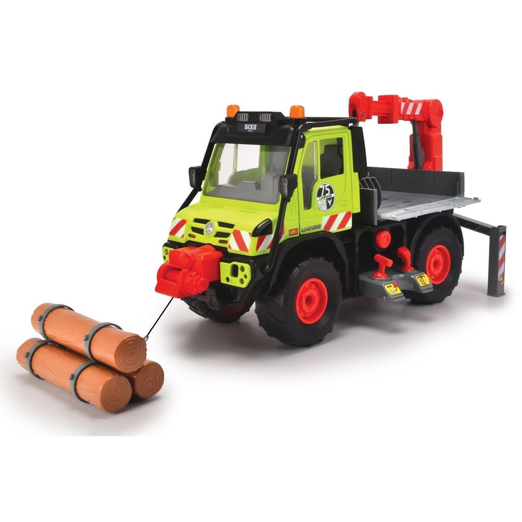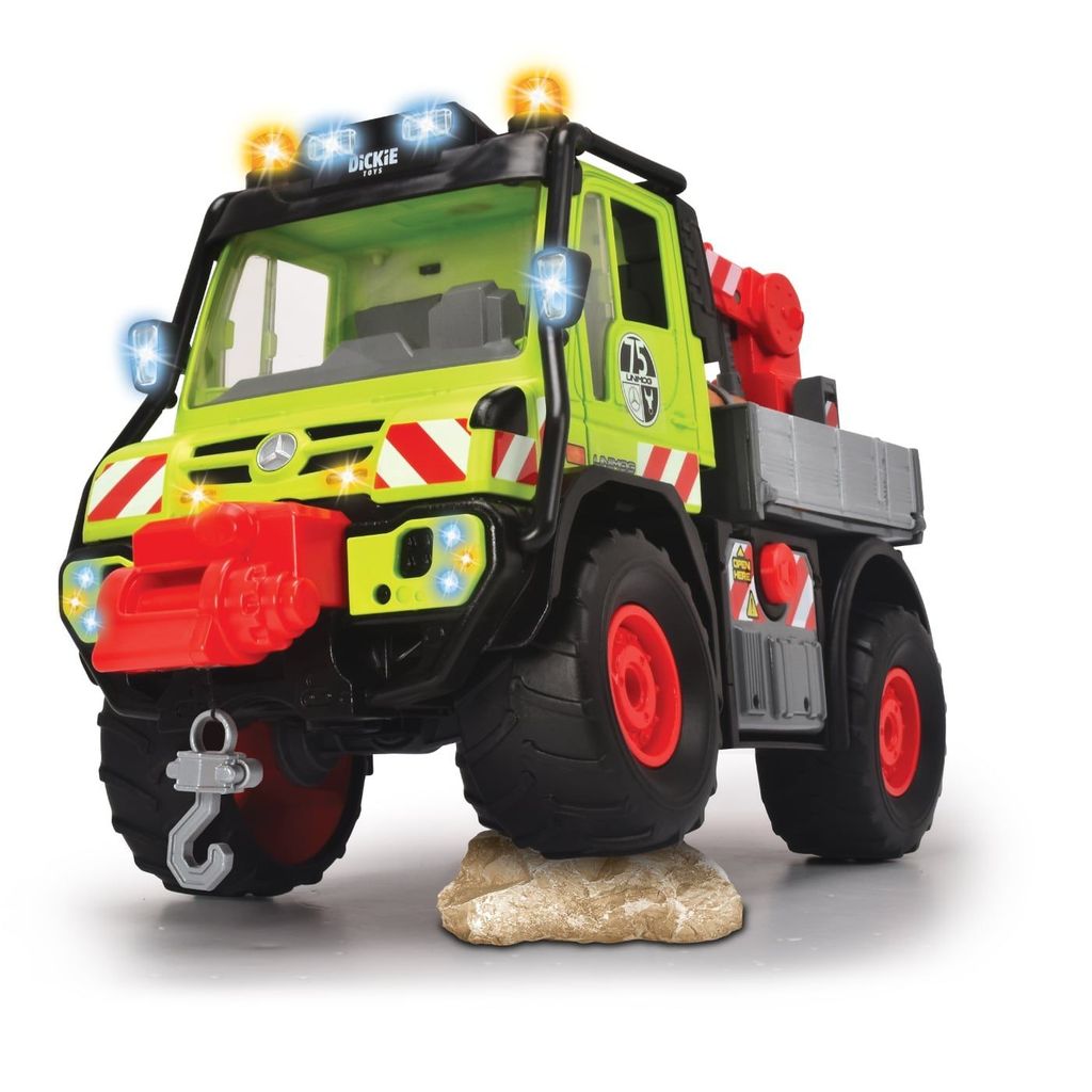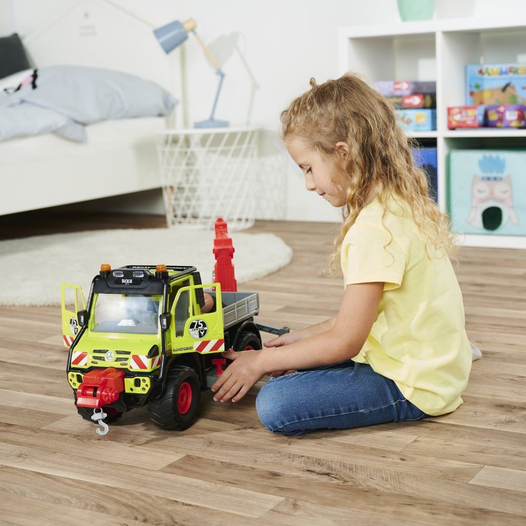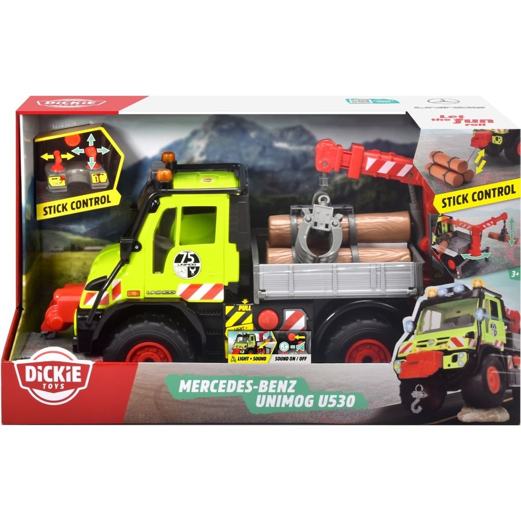 Mercedes-Benz Unimog U530 från Dickie Toys är en stor och rejäl leksaksbil med ljud- och ljusfunktioner samt stickkontroll för att manövrera kran och vinsch.