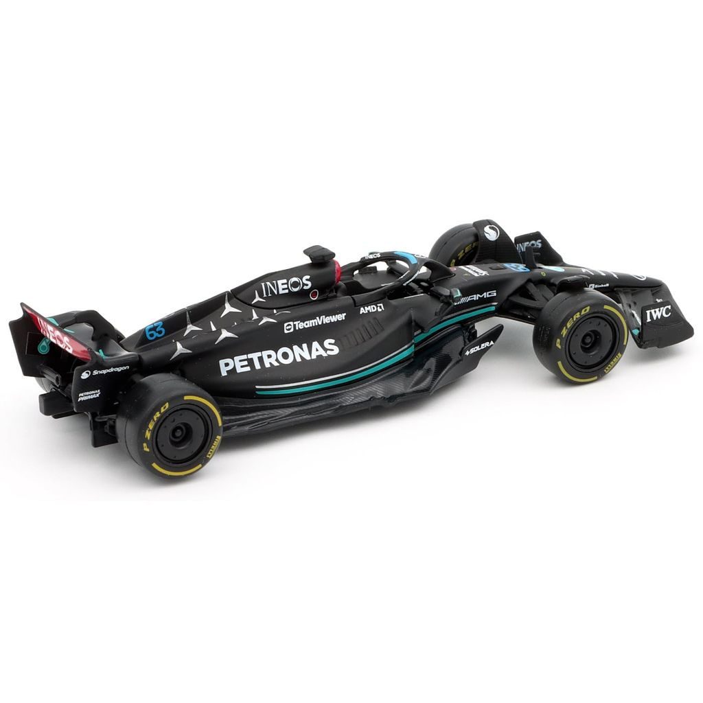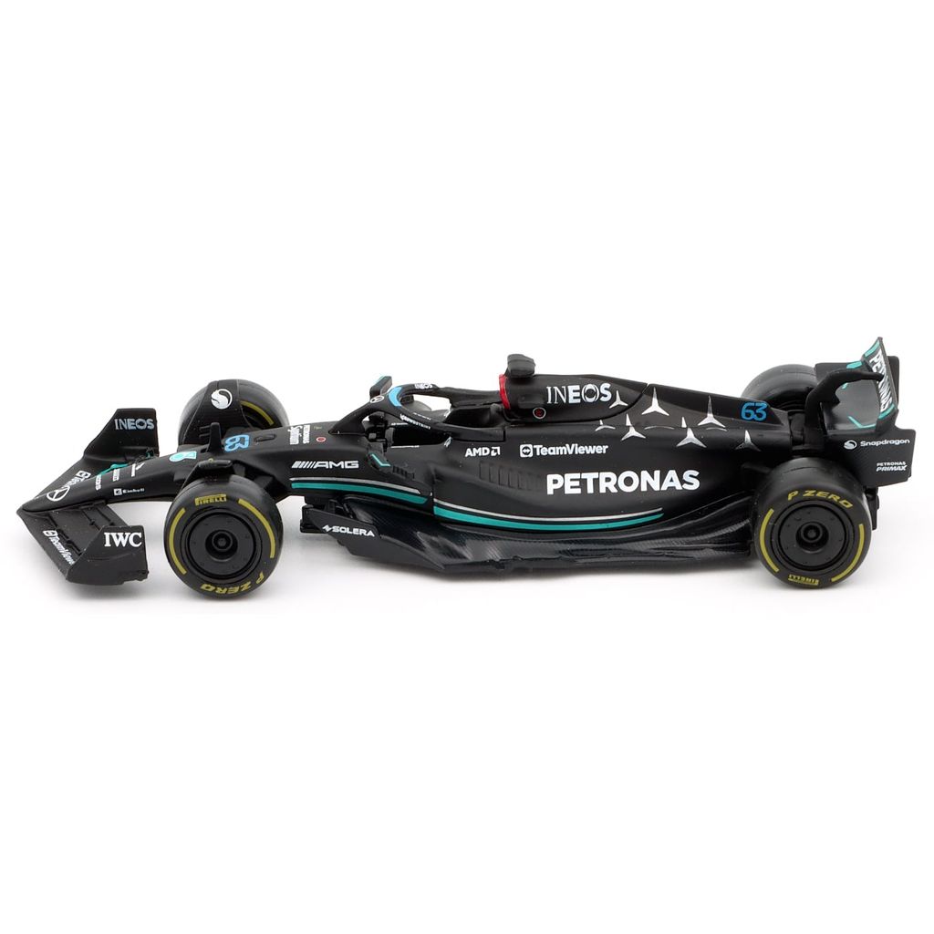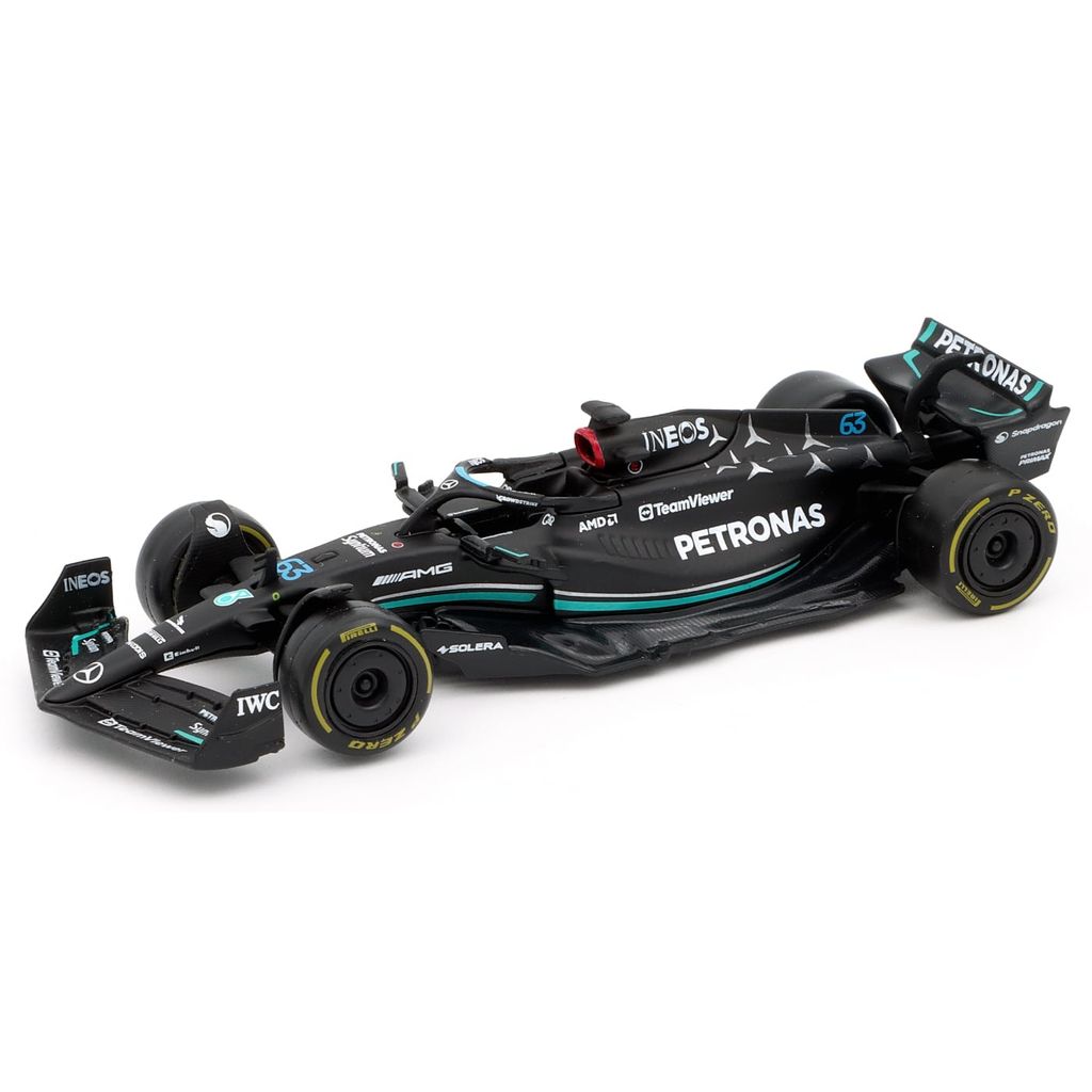 Modell av formel 1-bilen Mercedes-AMG F1 W14 E Performance från Mercedes. Denna bil, med nummer 63, kördes säsongen 2023 av George Russell. som slutade på åttonde plats med 175 poäng under säsongen. Bilen ingår i teamet Mercedes-AMG PETRONAS F1 Team från Brackley i Storbritannien.