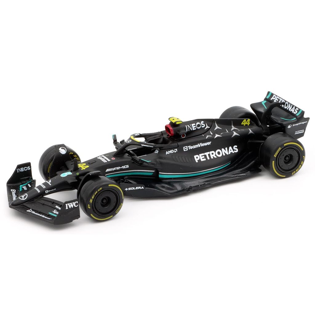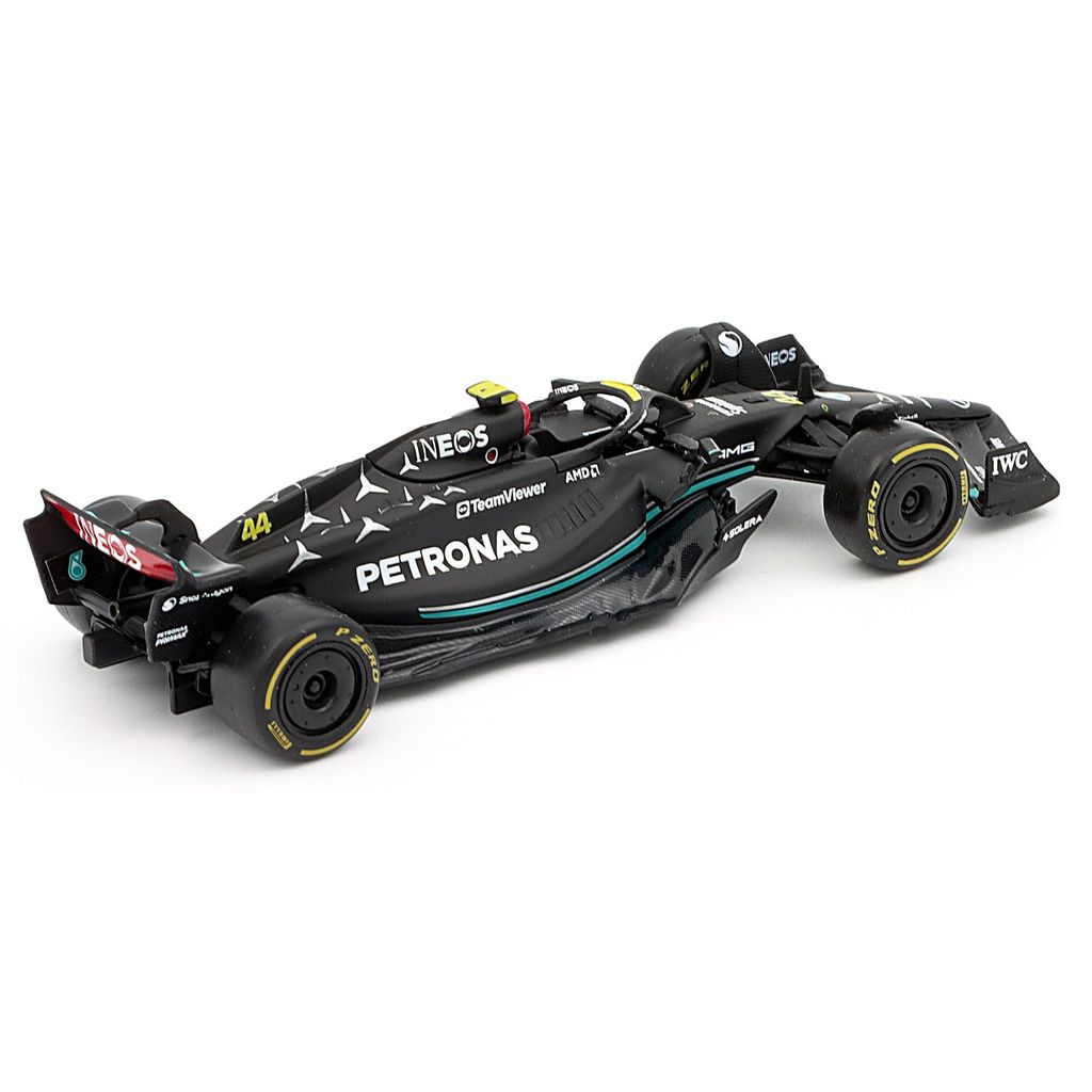 Modell av formel 1-bilen Mercedes-AMG F1 W14 E Performance från Mercedes. Denna bil, med nummer 44, kördes säsongen 2023 av Lewis Hamilton. som slutade på tredje plats med 234 poäng under säsongen. Bilen ingår i teamet Mercedes-AMG PETRONAS F1 Team från Brackley i Storbritannien.