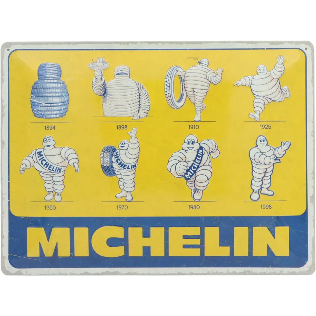 Gul och blå plåtskylt som visar uhr däcktillverkarens Michelins logotyp förändrats genom åren. Skylten är 40 x 30 cm.