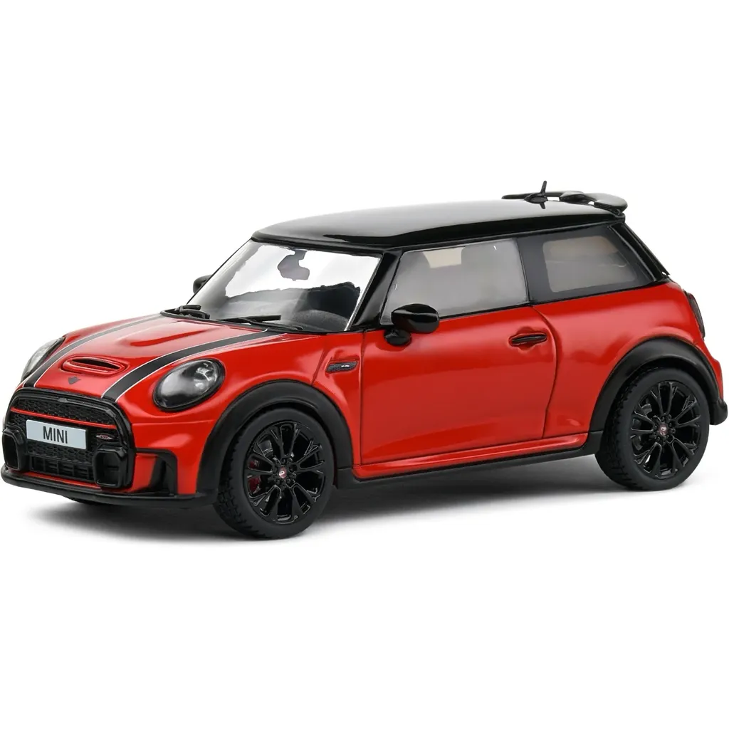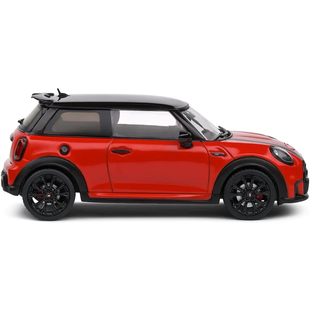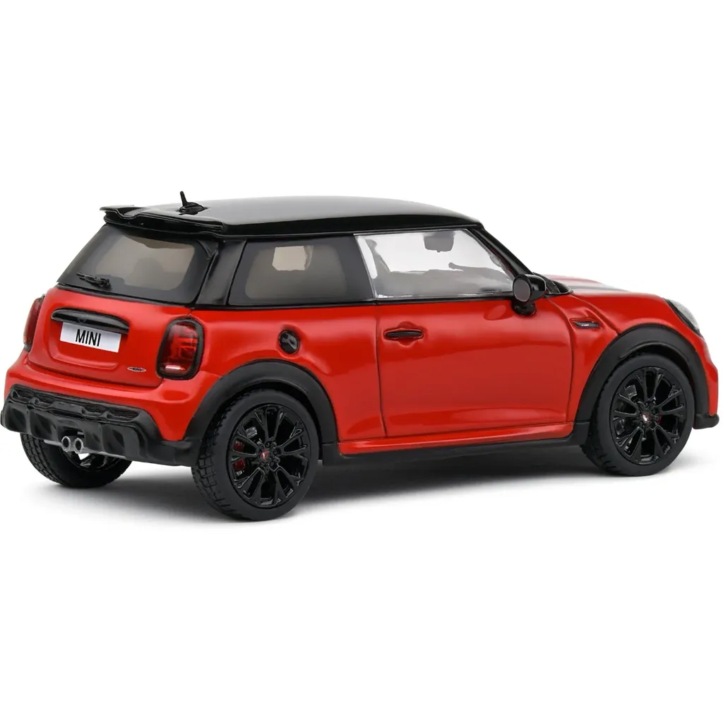 Mini Cooper John Works (F56), årsmodell 2023, som modellbil från franska Solido. Modellen är tillverkad i skala 1:43 vilket för denna modell blir 9 cm Mini. Färgen är röd (Chilli Red).