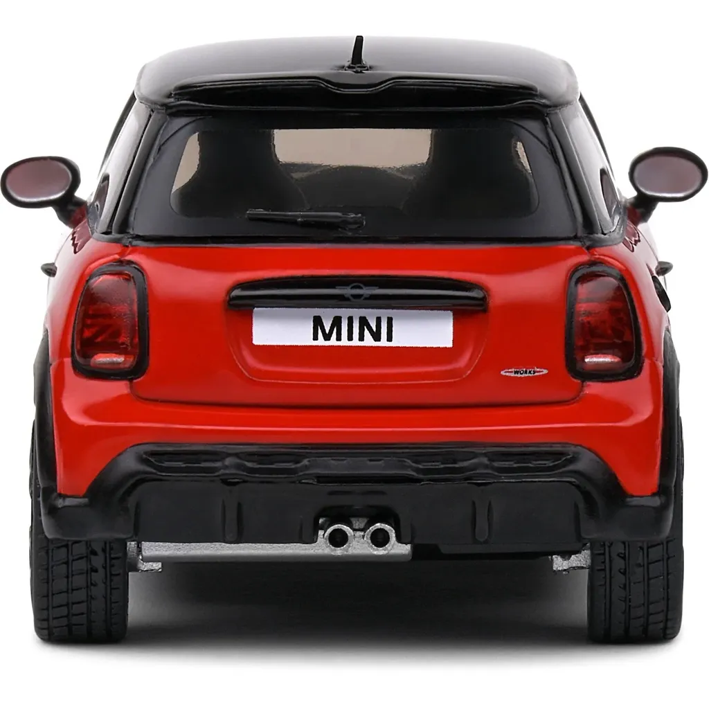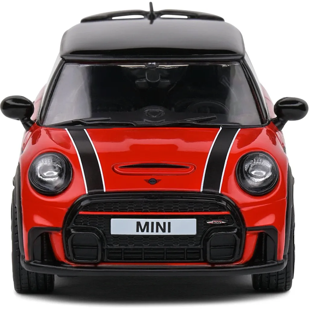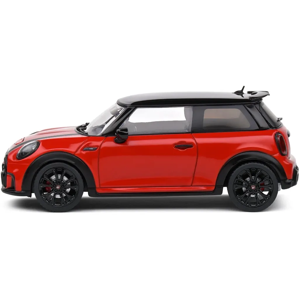 Mini Cooper John Works (F56), årsmodell 2023, som modellbil från franska Solido. Modellen är tillverkad i skala 1:43 vilket för denna modell blir 9 cm Mini. Färgen är röd (Chilli Red).