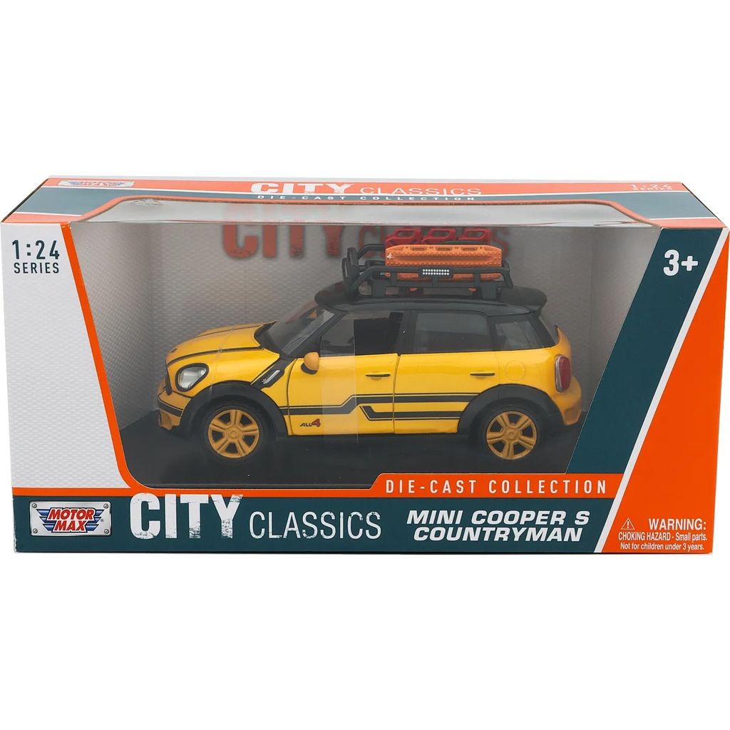 Gul Mini Cooper S Countryman från Motormax i skala 1:24 (17 cm). Bilen ingår i Motormax serie City Classics.