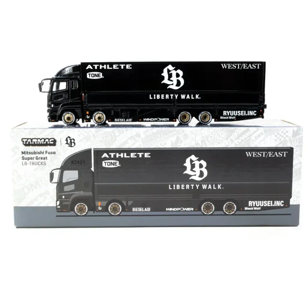 Mitsubishi Fuso Super Great LB-TRUCKS, Liberty Walk, som modell från Tarmac Works i skala 1:64. Dragbilen med trailer ingår i Tarmacs serie TRUCK64.