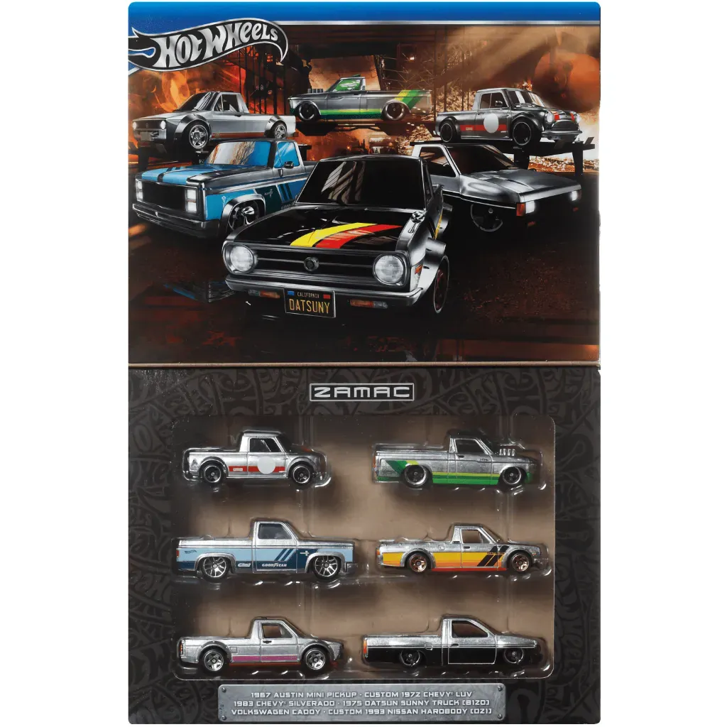 Set med 6 ZAMAC-bilar från Hot Wheels. Bilarna är från Volkswagen, Chevrolet, Mini, Datsun och Nissan.