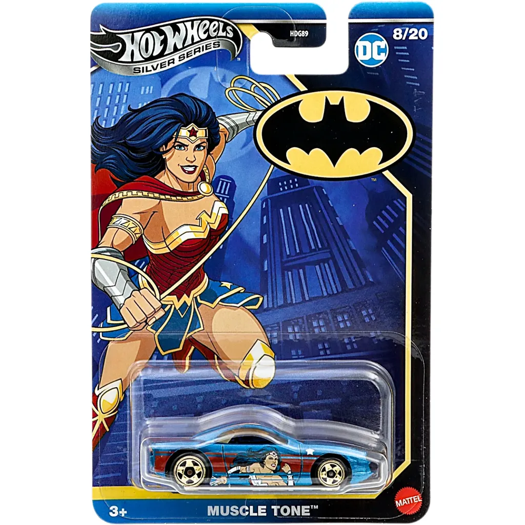 Metallicblå Muscle Tone från Hot Wheels och deras serie Batman. Just denna bil är släppt 2025 och dekorerad med Wonder Woman.