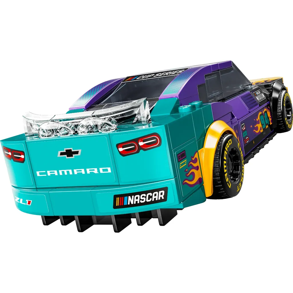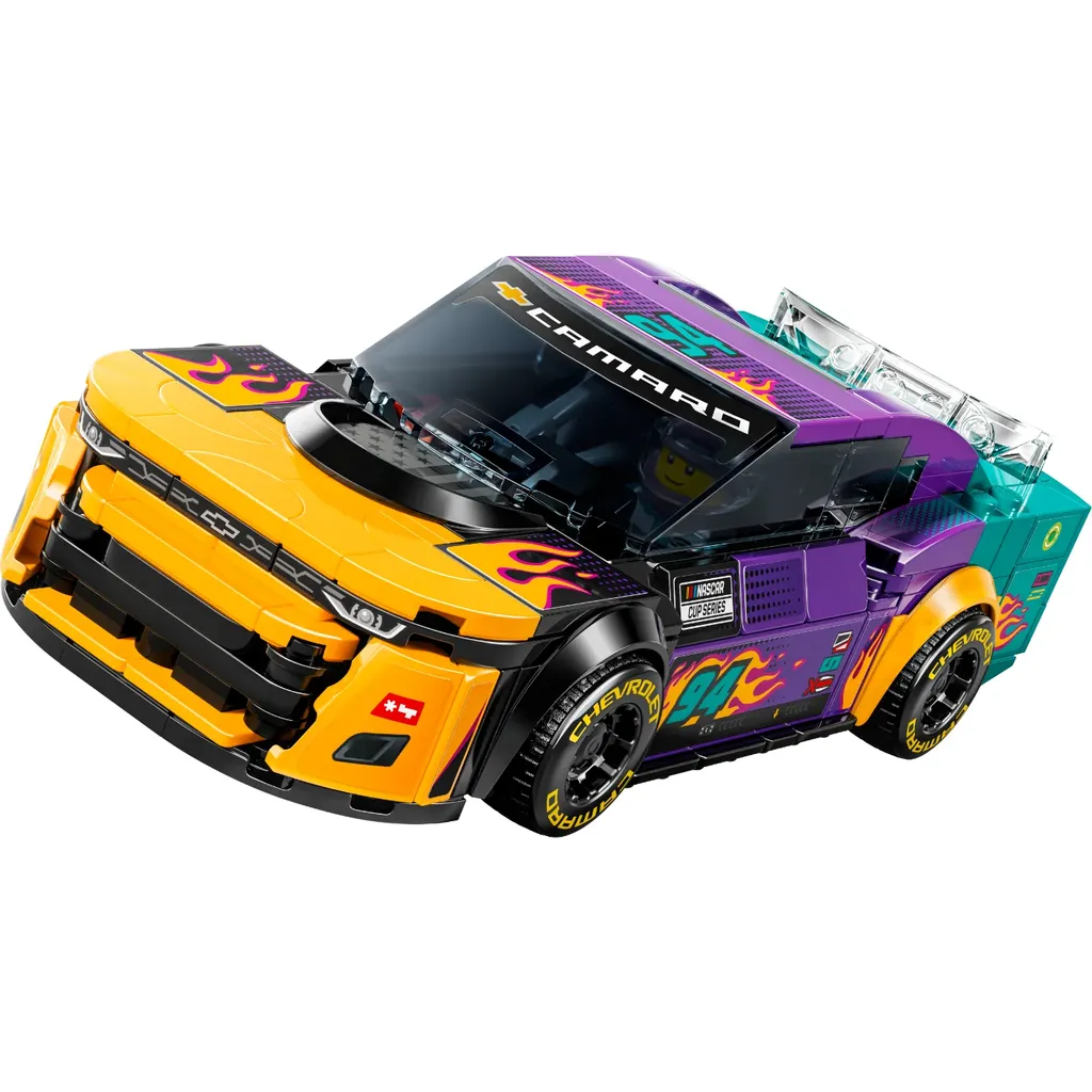 NASCAR-bilen Next Gen Chevrolet Camaro ZL1 från LEGO och serien Speed Champions. Chevroleten är lila, gul och grön och en minifigur som kan köra tävlingsbilen medföljer.