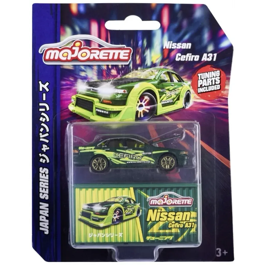Nissan Cefiro A31 från Majorette och serien Japan Series. Cefiron är 7,7 cm lång och har öppningsbar motorhuv.