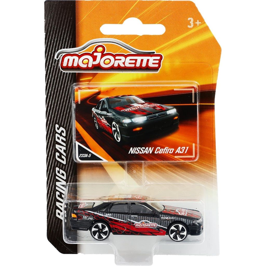 Svart, och lite röd, Nissan Cefiro A31 från Majorette och serien Racing Cars. Skalan är 1:58 vilket ger Nissanen en längd på ca 7,5 cm.