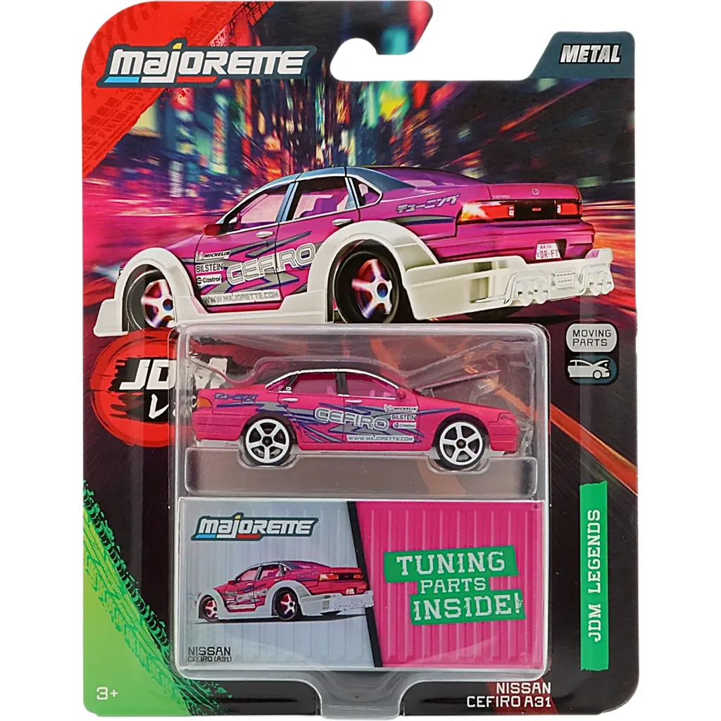 Nissan Cefiro A31 från Majorette och serien JDM Legends Deluxe. Bilen är tillverkad i metall med plastdetaljer och är ca 7 cm lång.