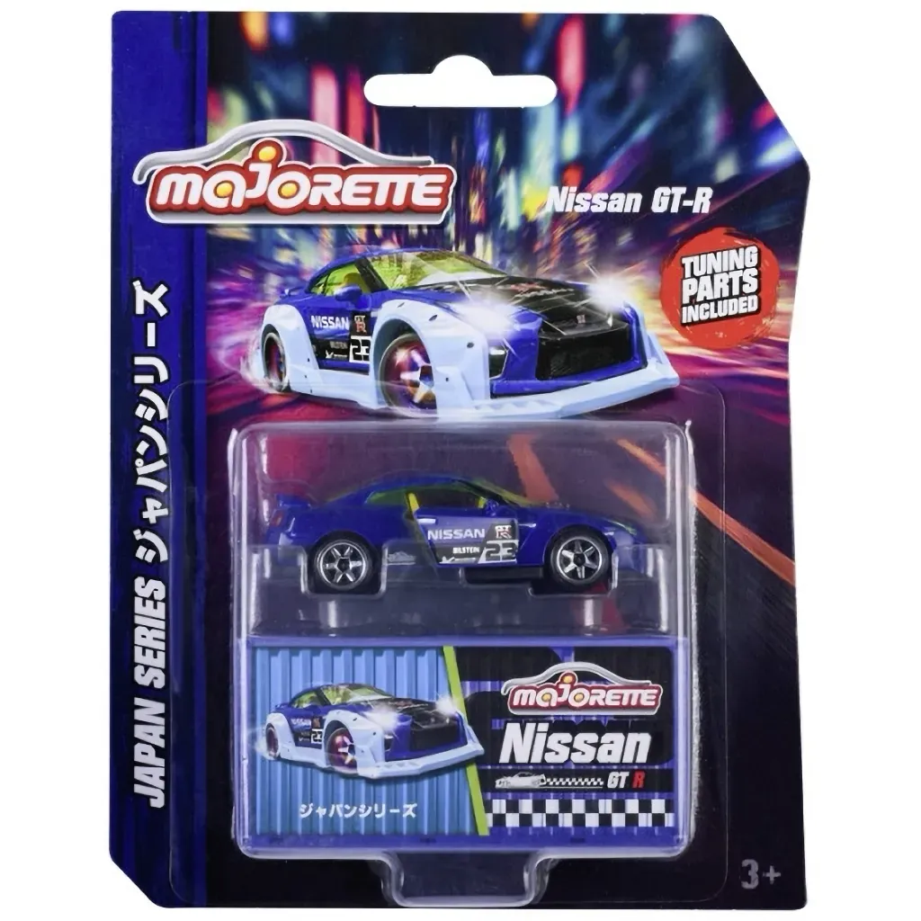 Nissan GT-R från Majorette och serien Japan Series. GT-R:en är 7,5 cm lång och har öppningsbara dörrar.