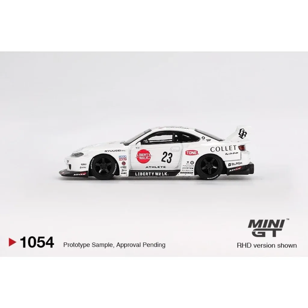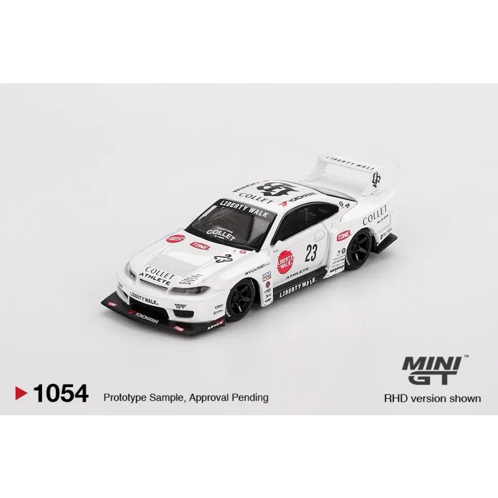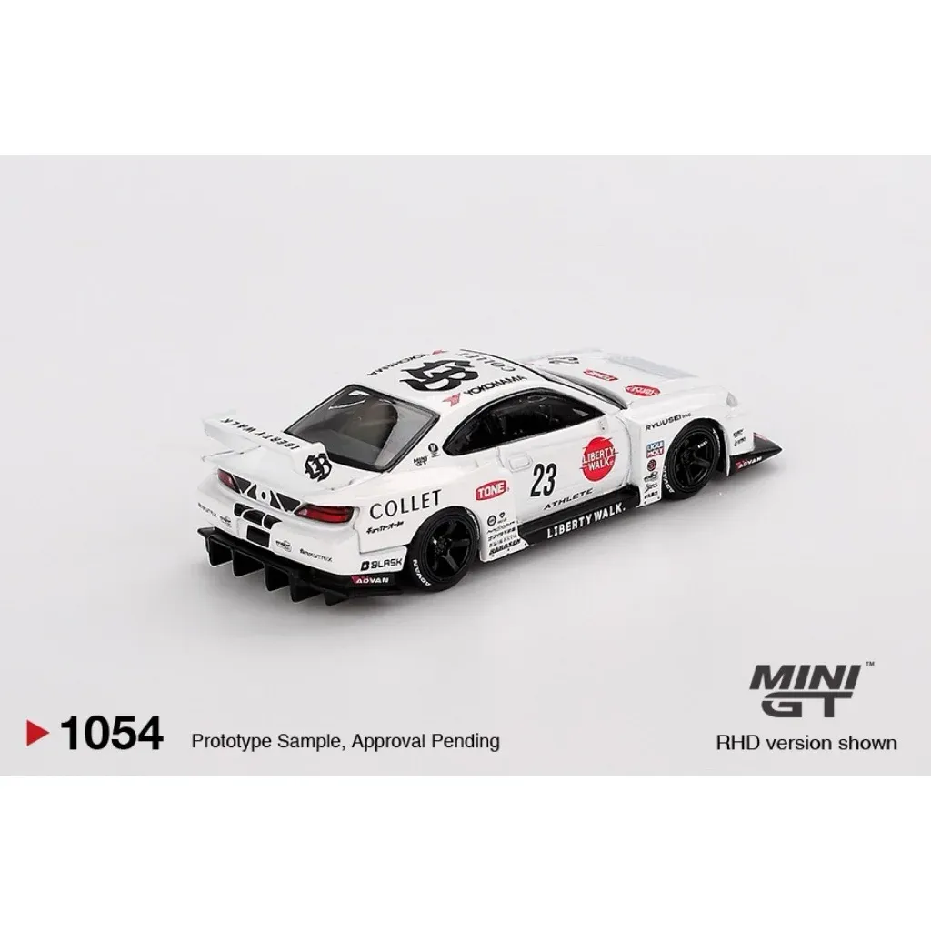 Nissan S15 SILVIA LB-Super Silhouette ATHLETE som modell från Mini GT i skala 1:64 (ca 7 cm). Bilen är vit och svart med ett body kit från Liberty Walk.