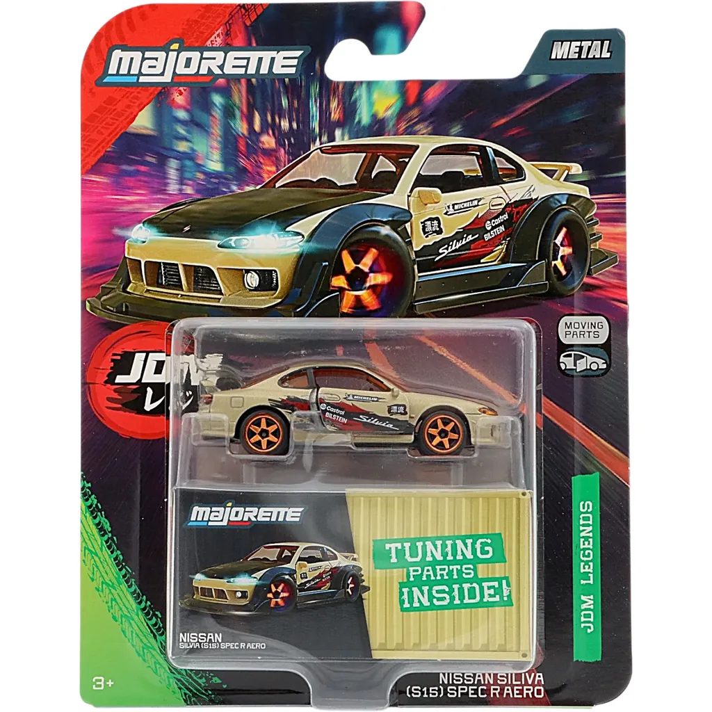 Nissan Silvia (S15) Spec R Aero från Majorette och serien JDM Legends Deluxe. Bilen är tillverkad i metall med plastdetaljer och är ca 7 cm lång.