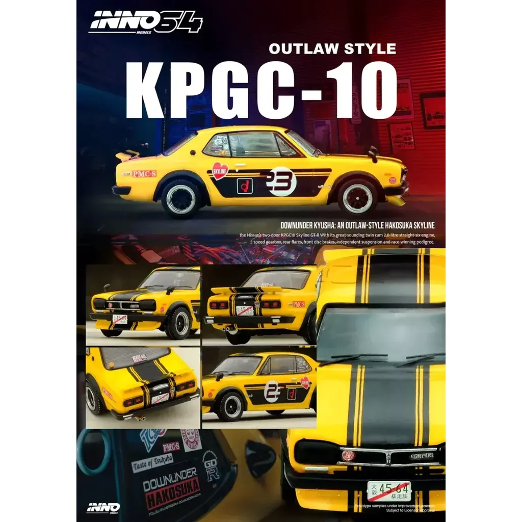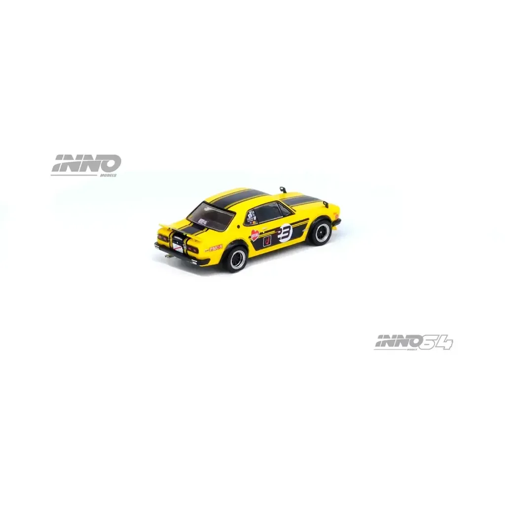 Nissan Skyline 2000 GT-R (KGC10) från Inno64 (Inno Models) i skala 1:64 (7 cm). Skylinen är gul med svarta detaljer.