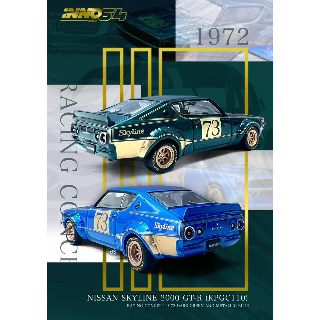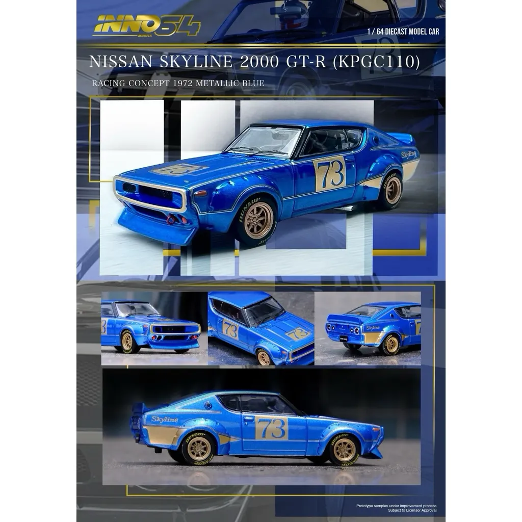 Nissan Skyline 2000 GT-R (KPGC110) Racing Concept 1972 från Inno64 (Inno Models) i skala 1:64 (7 cm). Skylinen är blåmetallic med detaljer i guld.