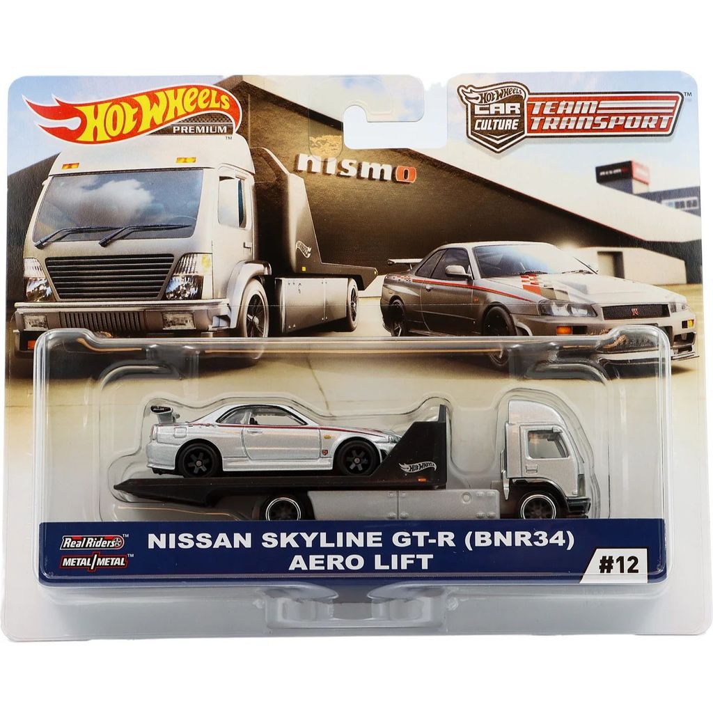 Från Hot Wheels saluför vi denna Hot Wheels Premium 2019, Car Culture, Team Transport #12. Transporten består av en Nissan Skyline GT-R (BNR34) som transporteras på en Aero Lift.
