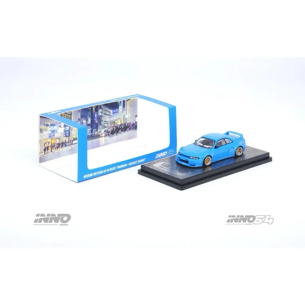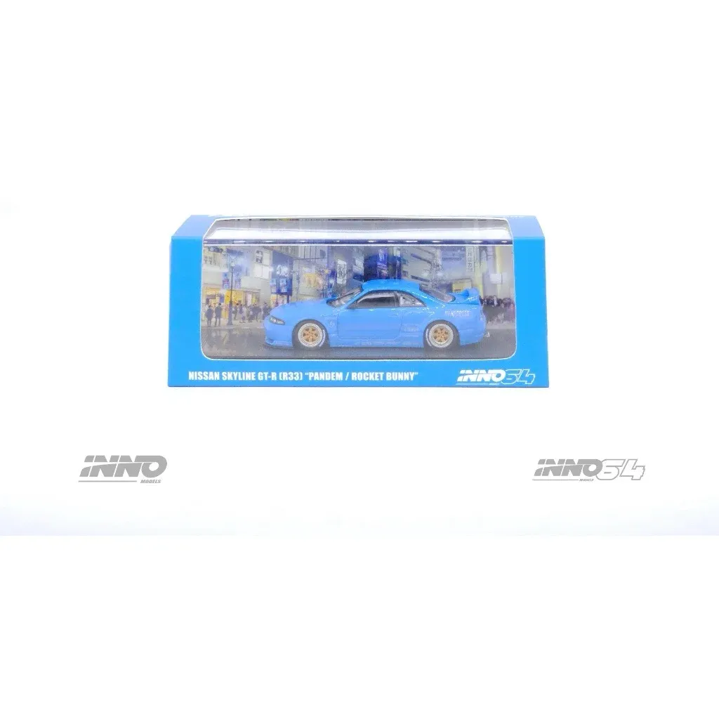 Blå Nissan Skyline GT-R (R33) "Pandem / Rocket Bunny" som modellbil i skala 1:64 (7,5 cm) från Inno Models och serien Inno64.