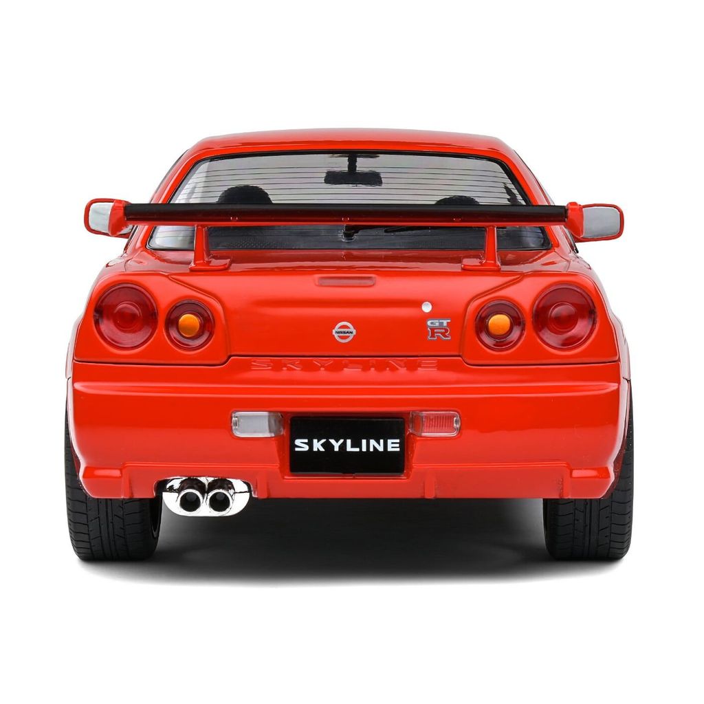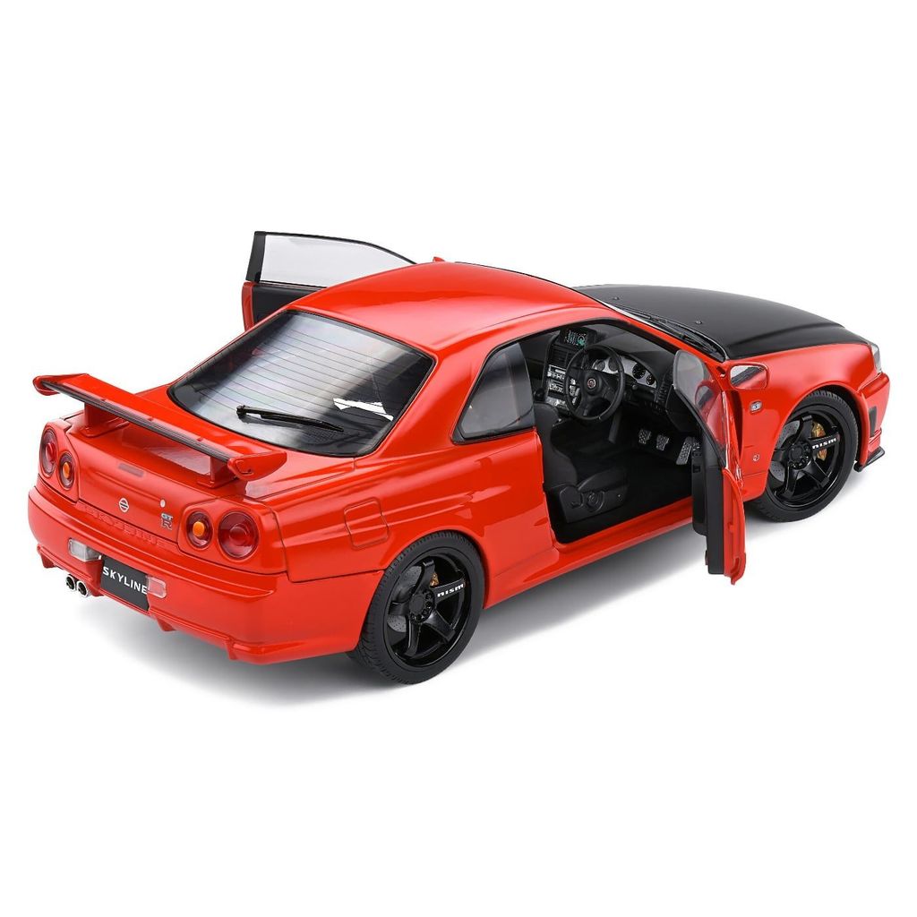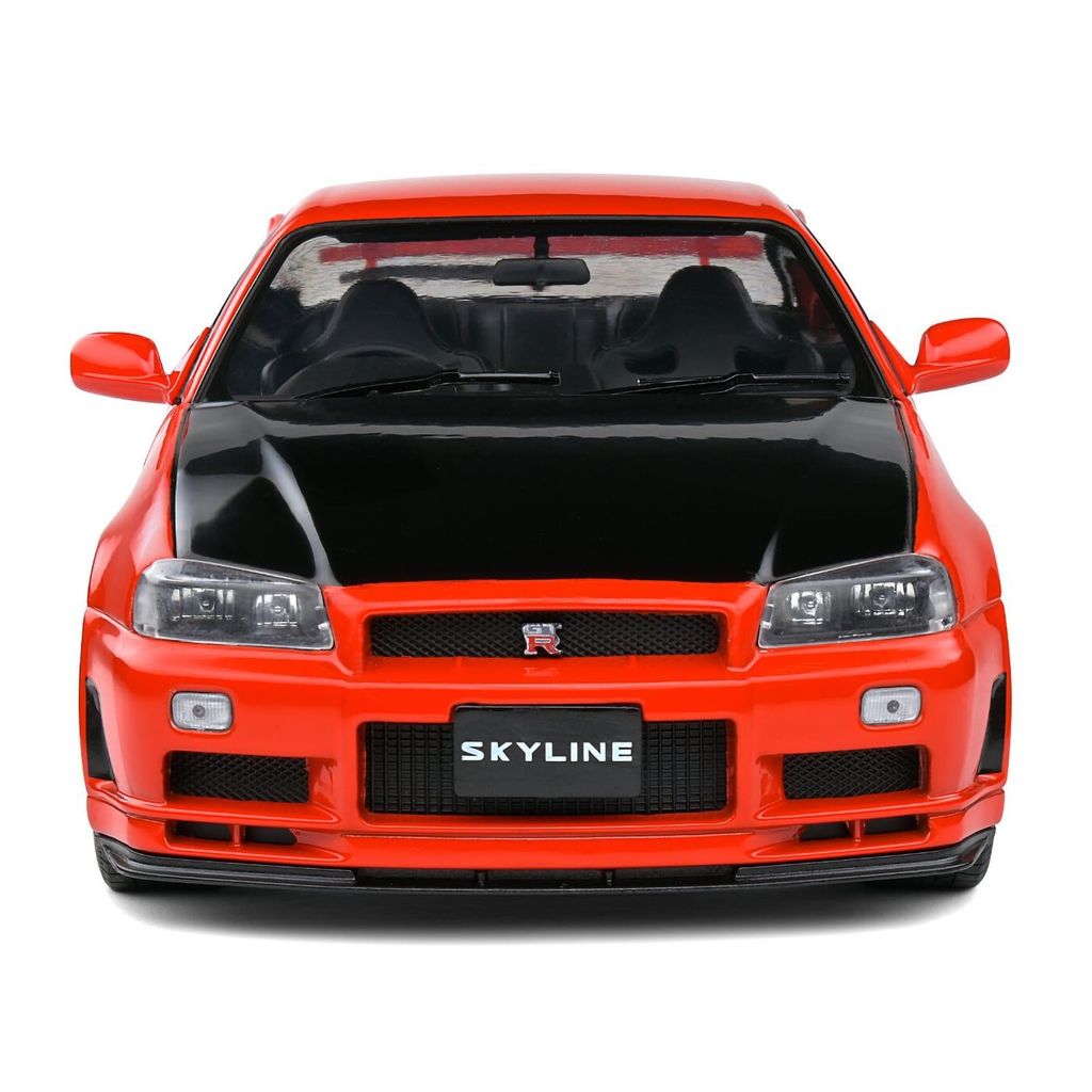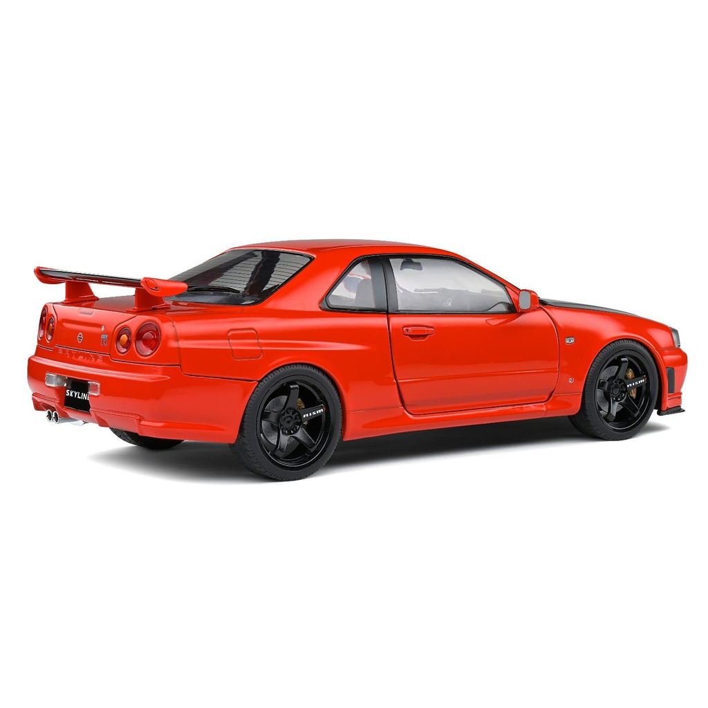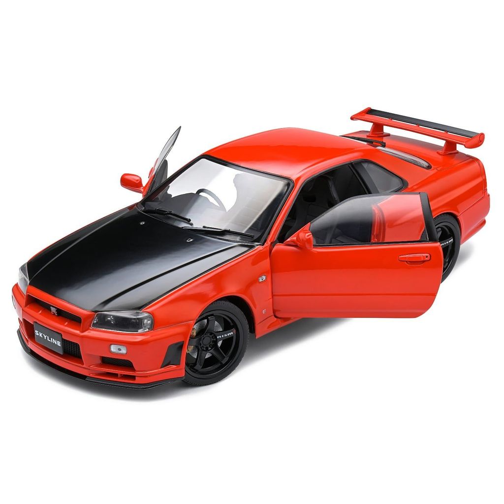 Modell från Solido i skala 1:18 där en röd Nissan Skyline GT-R (R34) årsmodell 1999 stått modell.