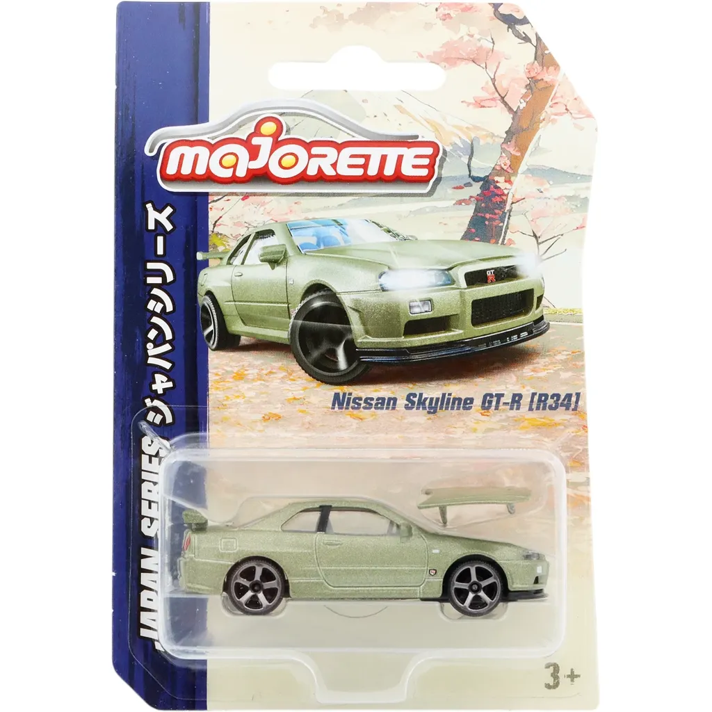 Ljusgrön Nissan Skyline GT-R (R34) från Majorette och serien Japan Series, Premium Cars. Bilen är 7,5 cm lång (skala 1:59).
