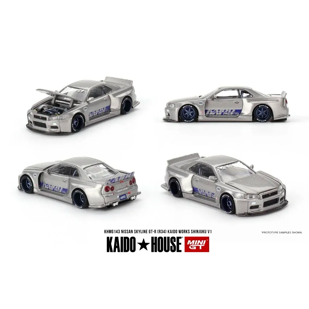 Nissan Skyline GT-R (R34) Kaido Works Shinjuku V1 som modellbil från Mini GT och serien Kaido House. Modellen är tillverkad i metall i skala 1:64 (ca 7 cm).
