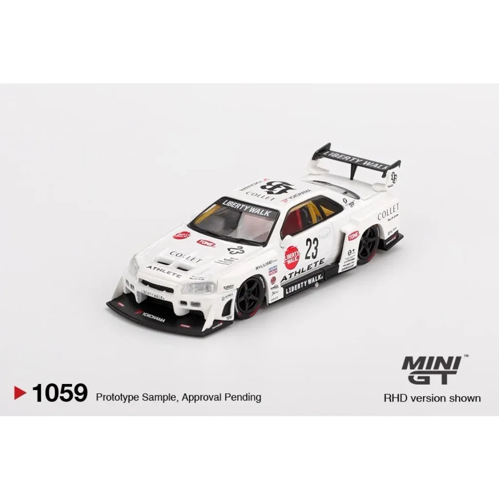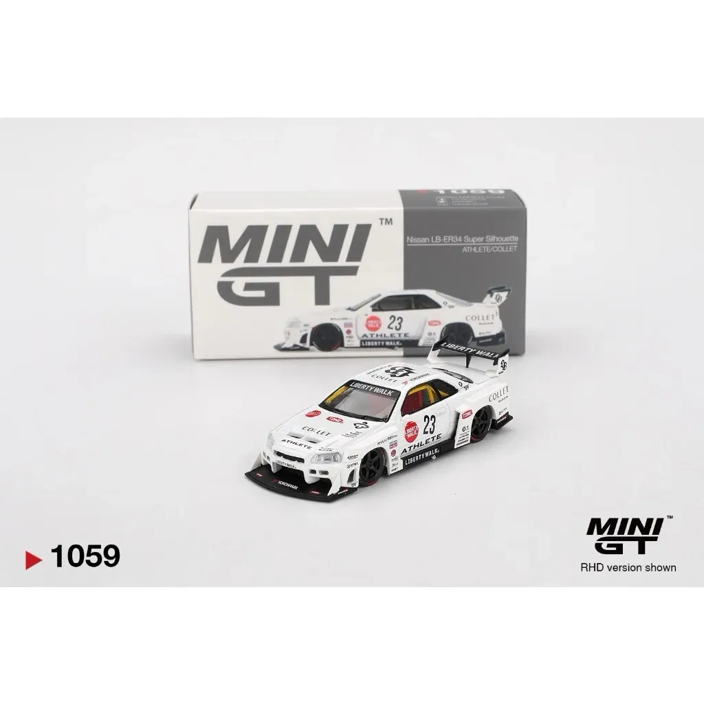 Nissan Skyline GT-R (R34) LB-ER34 Super Silhouette ATHLETE/COLLET som modell från Mini GT i skala 1:64 (ca 7 cm). Bilen är vit och delvis svart med ett body kit från Liberty Walk.