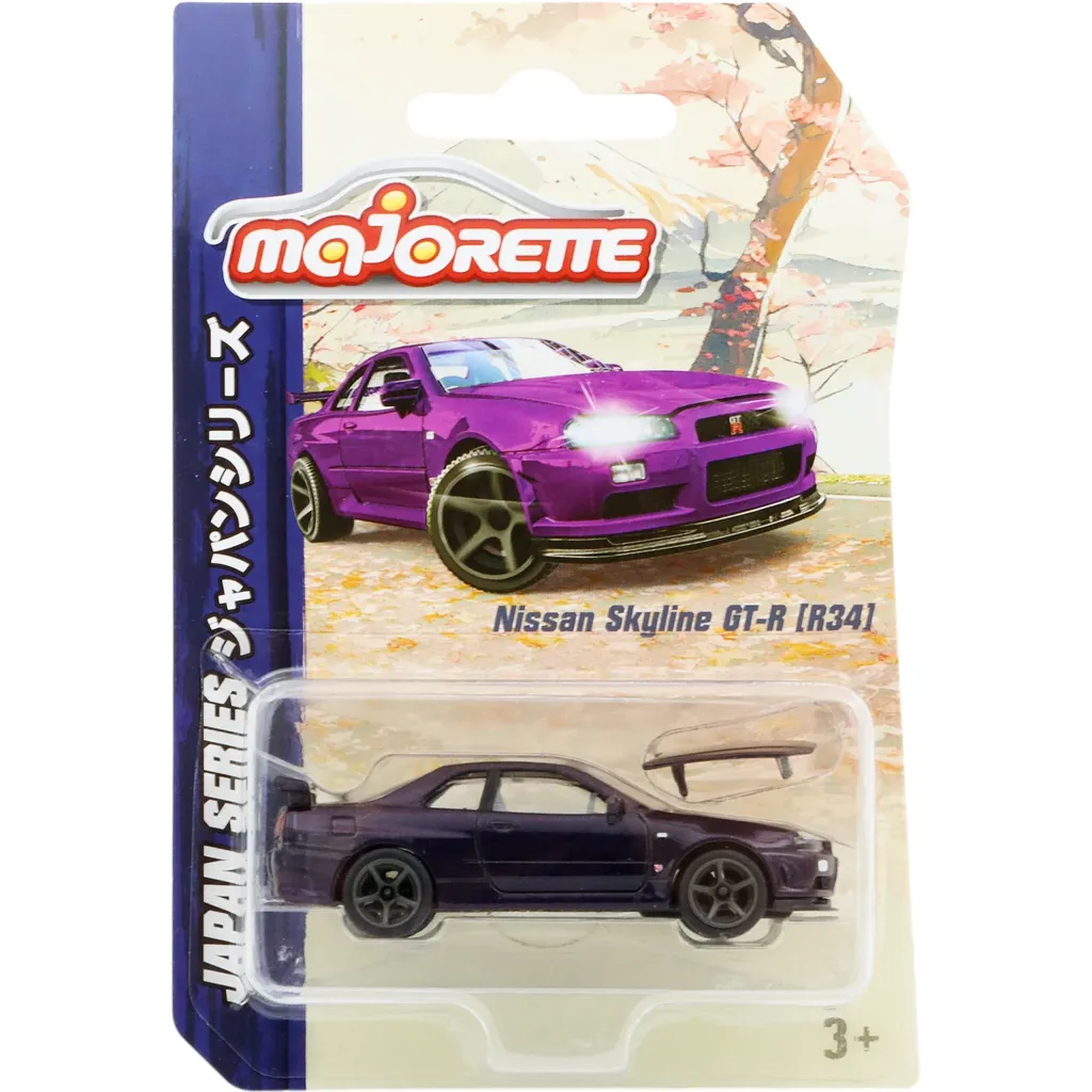 Lila Nissan Skyline GT-R (R34) från Majorette och serien Japan Series, Premium Cars. Bilen är 7,5 cm lång (skala 1:59).