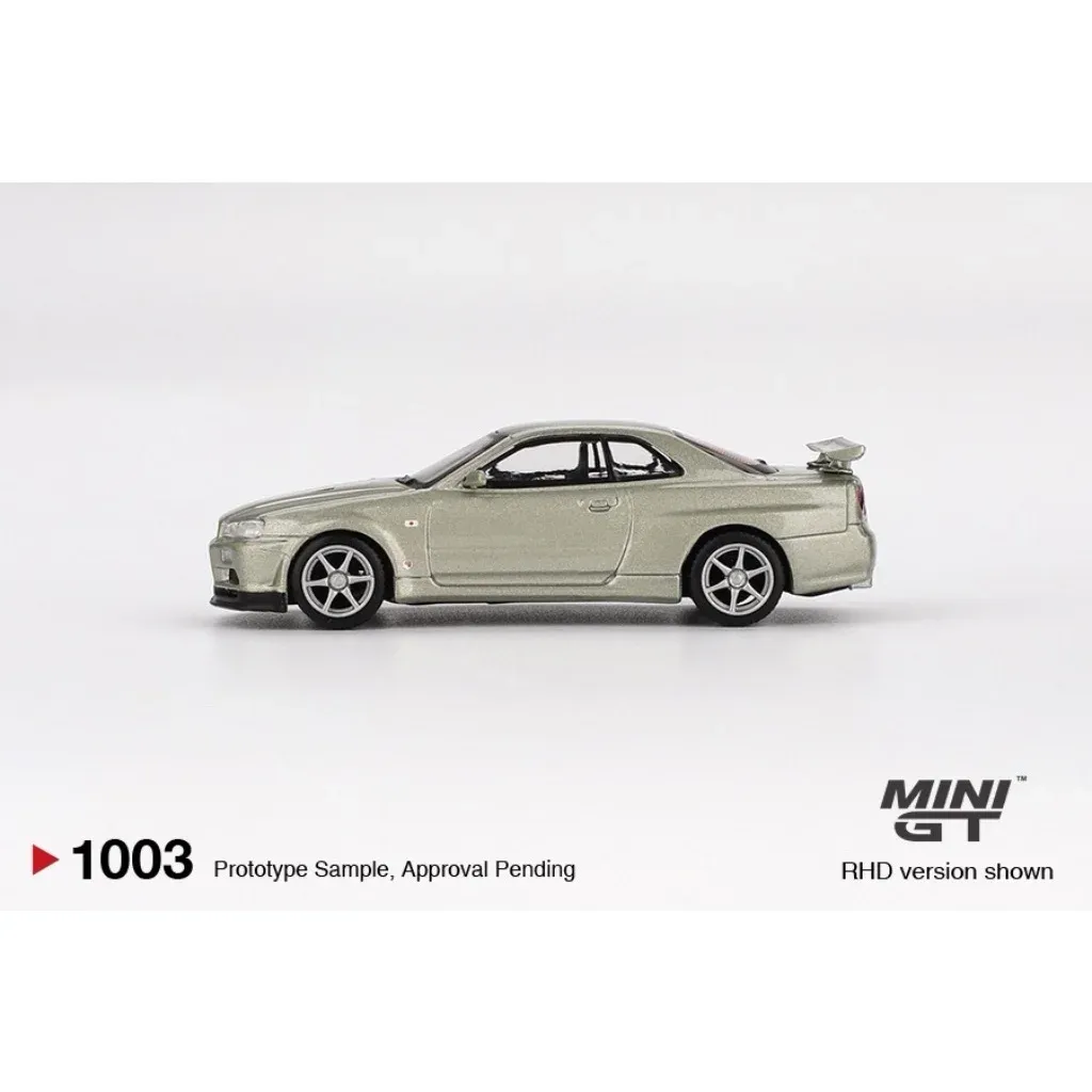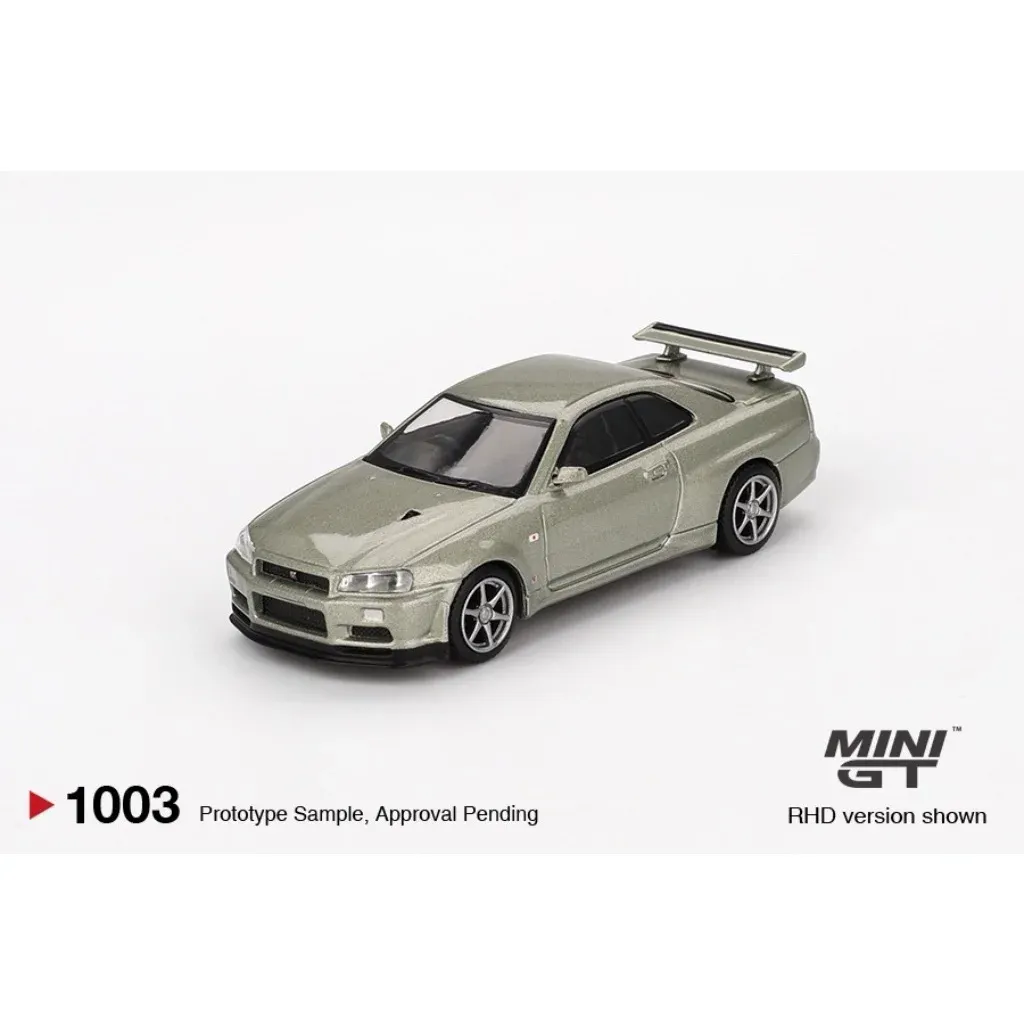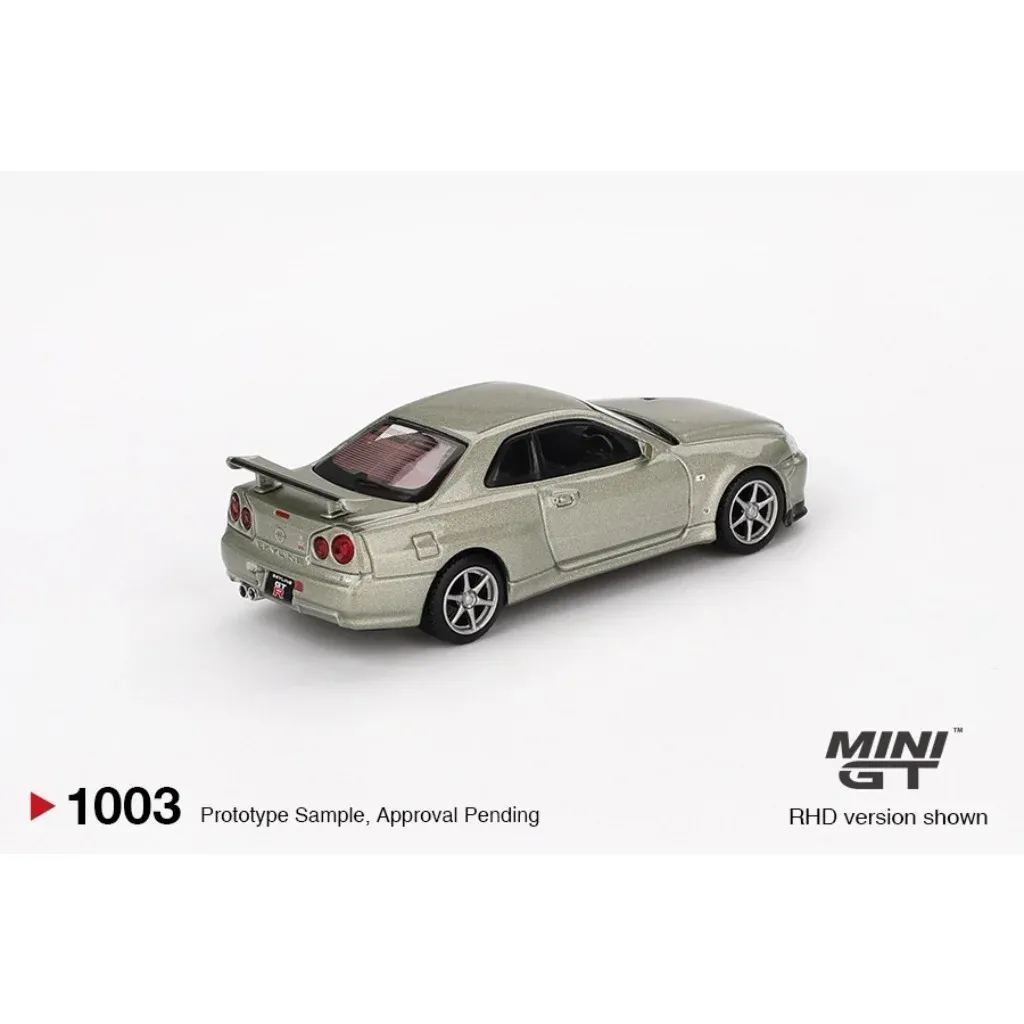 Nissan Skyline GT-R (R34) V-Spec II Nür som modell från Mini GT i skala 1:64 (ca 7 cm). Färgen är Millenium Jade (ljusgrön).