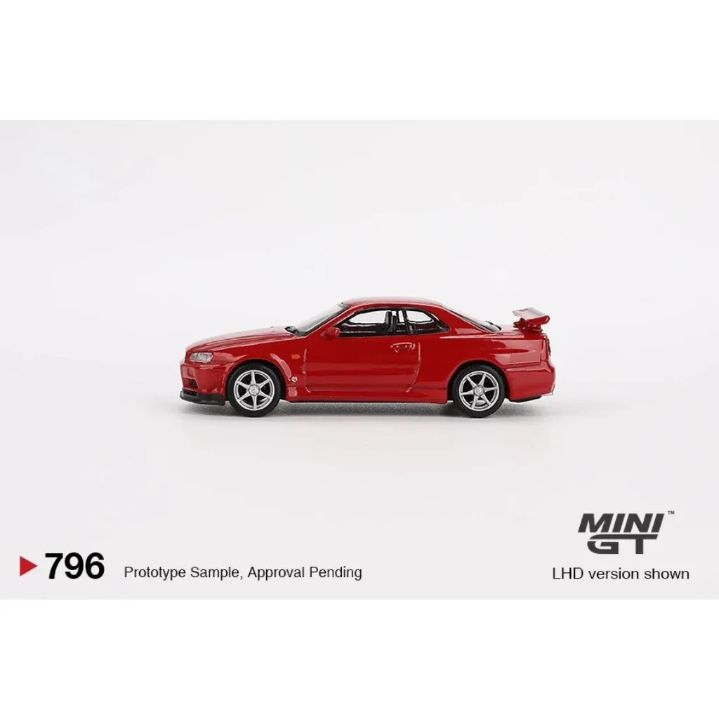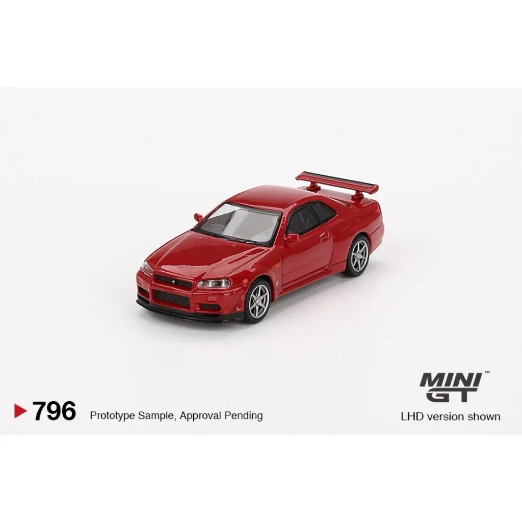 Modellbilens namn är "Nissan Skyline GT-R (R34) V-Spec Active Red RHD" där RHD innebär att bilen är högerstyrd med ratten på höger sida.
