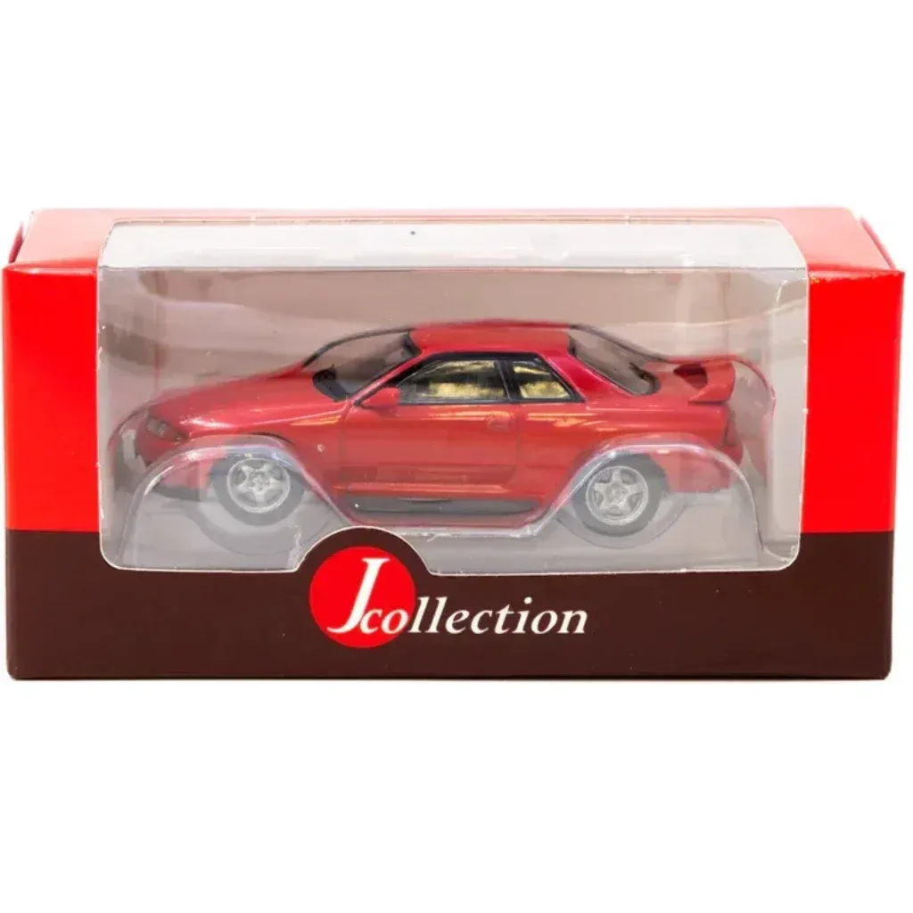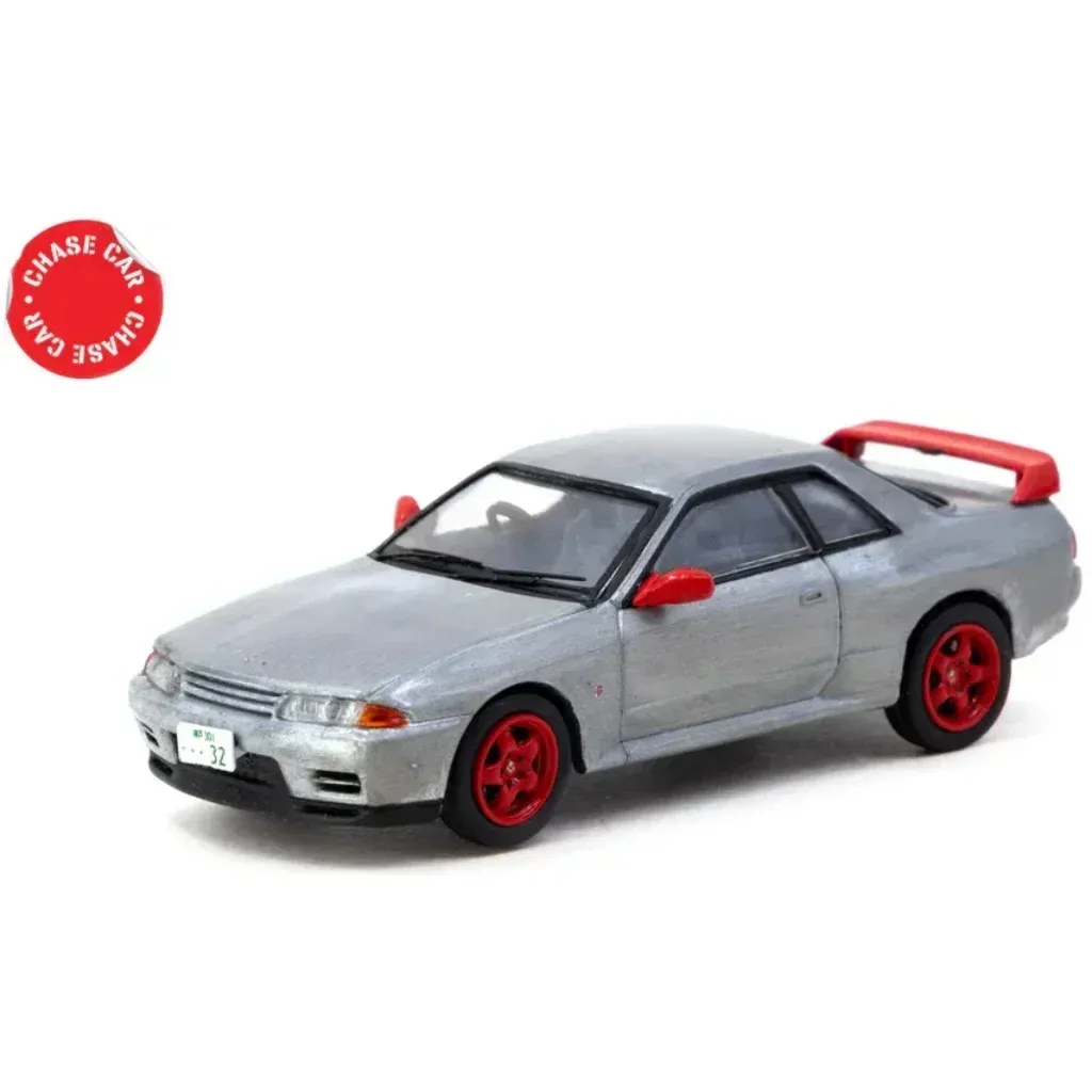 Röd + CHASE (olackad metall / ZAMAC) Nissan Skyline GT-R (BNR32) från J-Collection / Tarmac Works i skala 1:64 (7,3 cm). Du får alltså 2 bilar vid köp av denna produkt. Standard-version + chase-version.