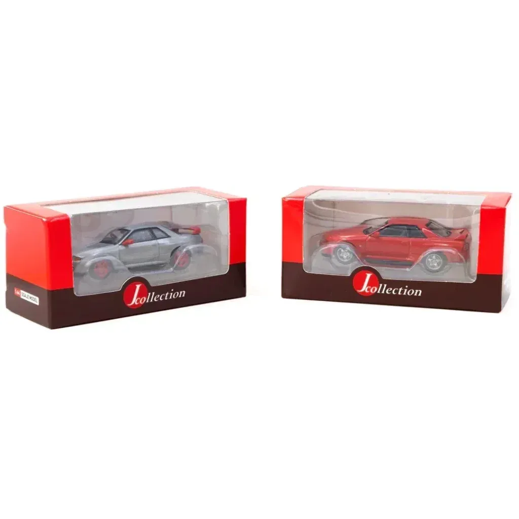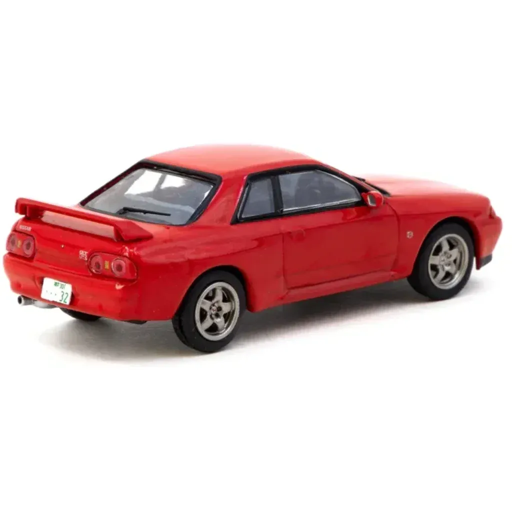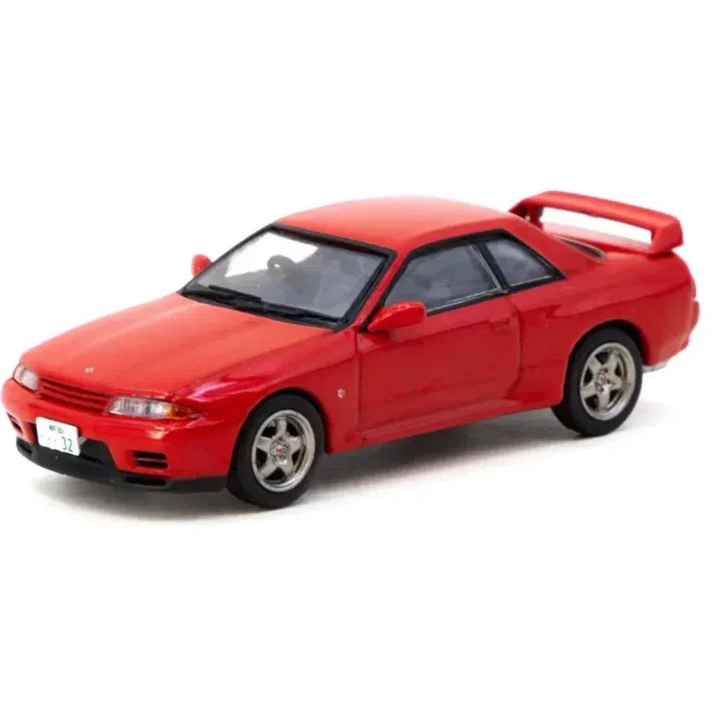 Röd + CHASE (olackad metall / ZAMAC) Nissan Skyline GT-R (BNR32) från J-Collection / Tarmac Works i skala 1:64 (7,3 cm). Du får alltså 2 bilar vid köp av denna produkt.