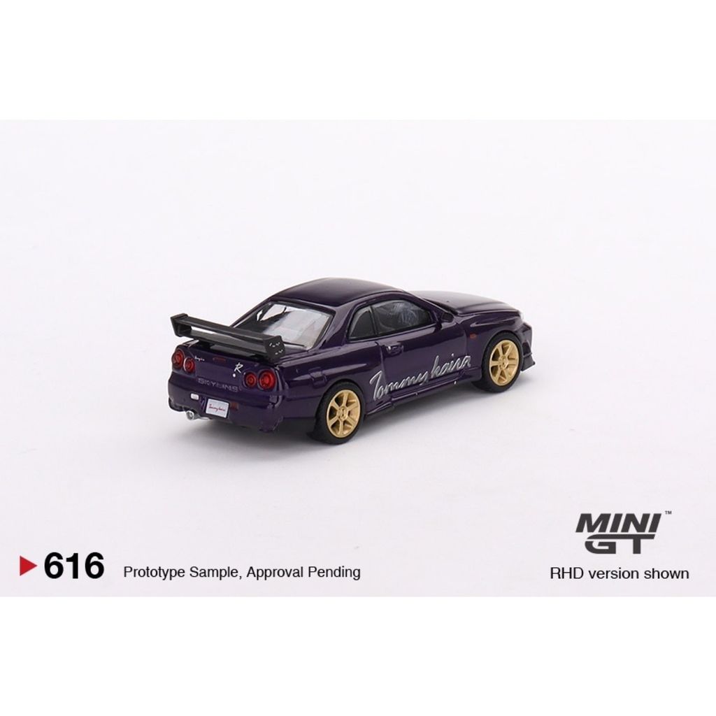 Nissan Skyline GT-R (R34) Tommykaira R-z i lila (Midnight Purple) från Mini GT i skala 1:64 (ca 7 cm).