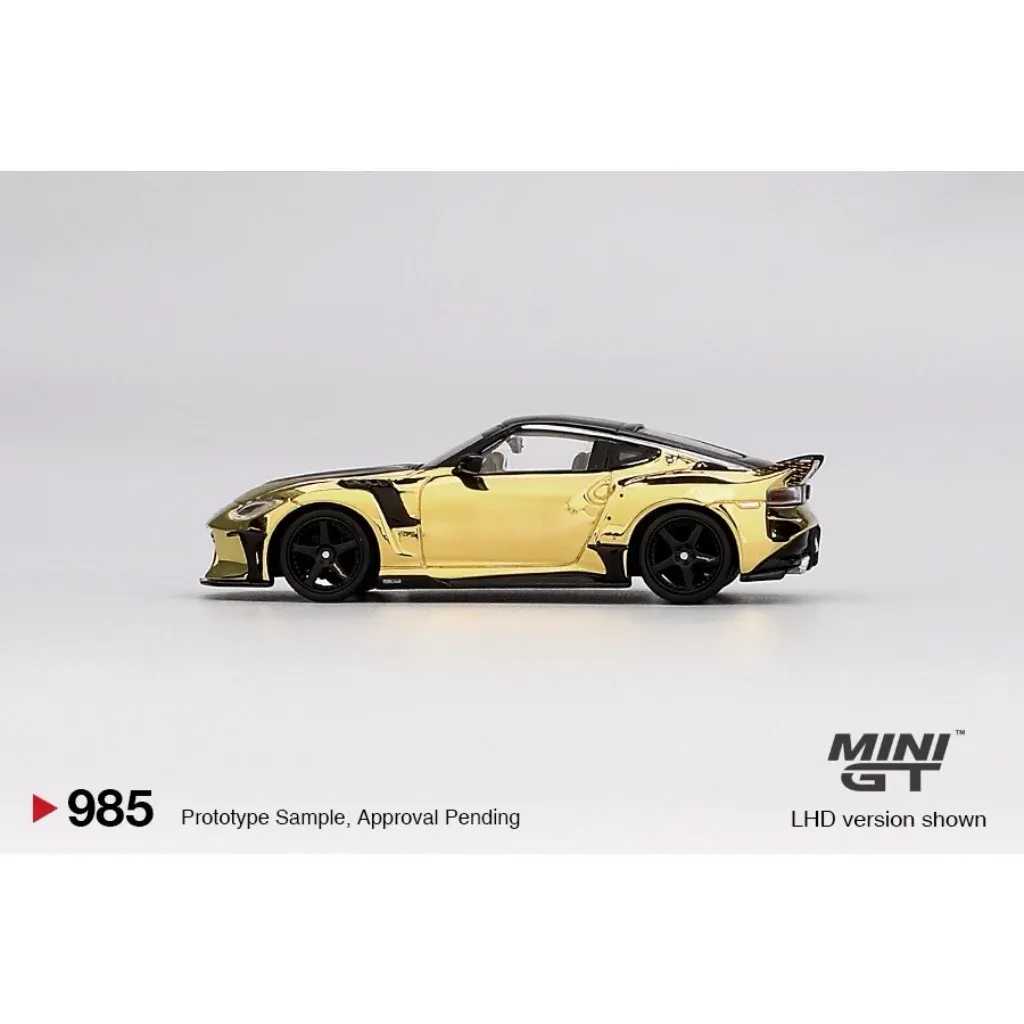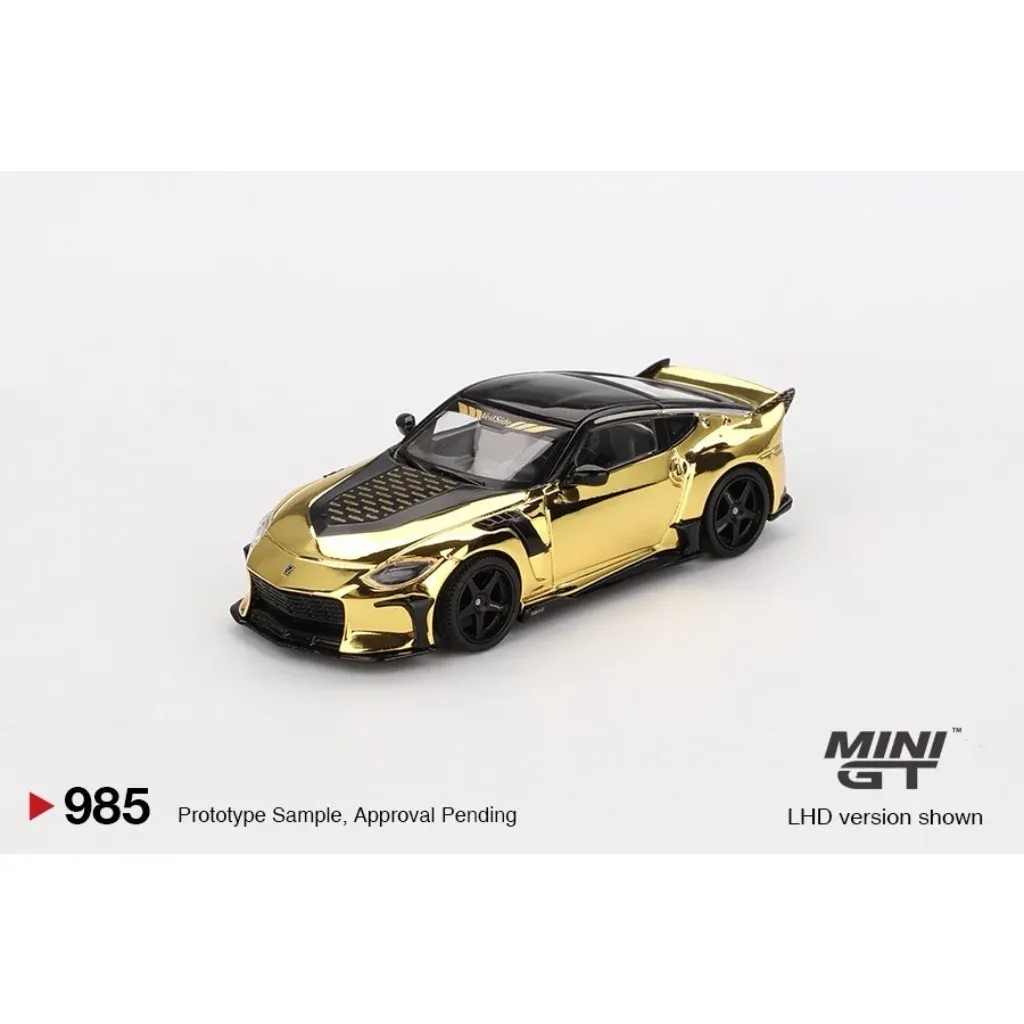 Nissan Z (RZ34) med bodykitet FFZ400 från VeilSide som modellbil från Mini GT i skala 1:64 (ca 7 cm). Bilen har färgen Gold Chrome med svarta fälgar.