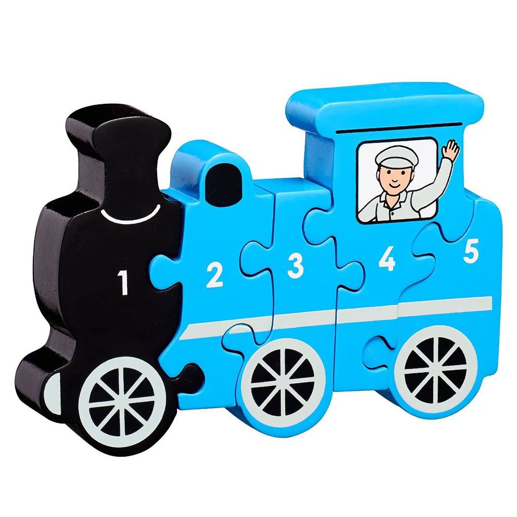 Nummerpussel, 5 bitar, i form av ett blått lok. Träpusslet är tillverkat av återvunna gummiträd i Sri Lanka från det brittiska varumärket Lanka Kade. Pusslets 5 bitar är numrerade från 1 till 5 och rekommenderas för barn mellan 1 och 5 år. Pusslet är 2,4 centimeter tjockt och håller hög kvalitet. Givetvis är produkten målad med giftfri färg.
