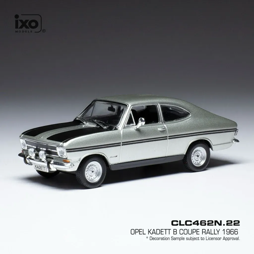 Opel Kadett B Coupe Rallye, årsmodell 1967, som modellbil från Ixo Models i skala 1:43 (9,5 cm). Silverfärgad lack med svarta ränder.