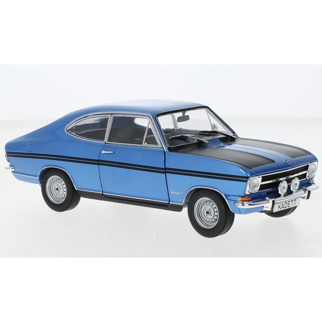 Modell av en Opel Kadett B Rallye från 1967. Färgen är blå, skalan 1:24 och varumärke är WhiteBox.