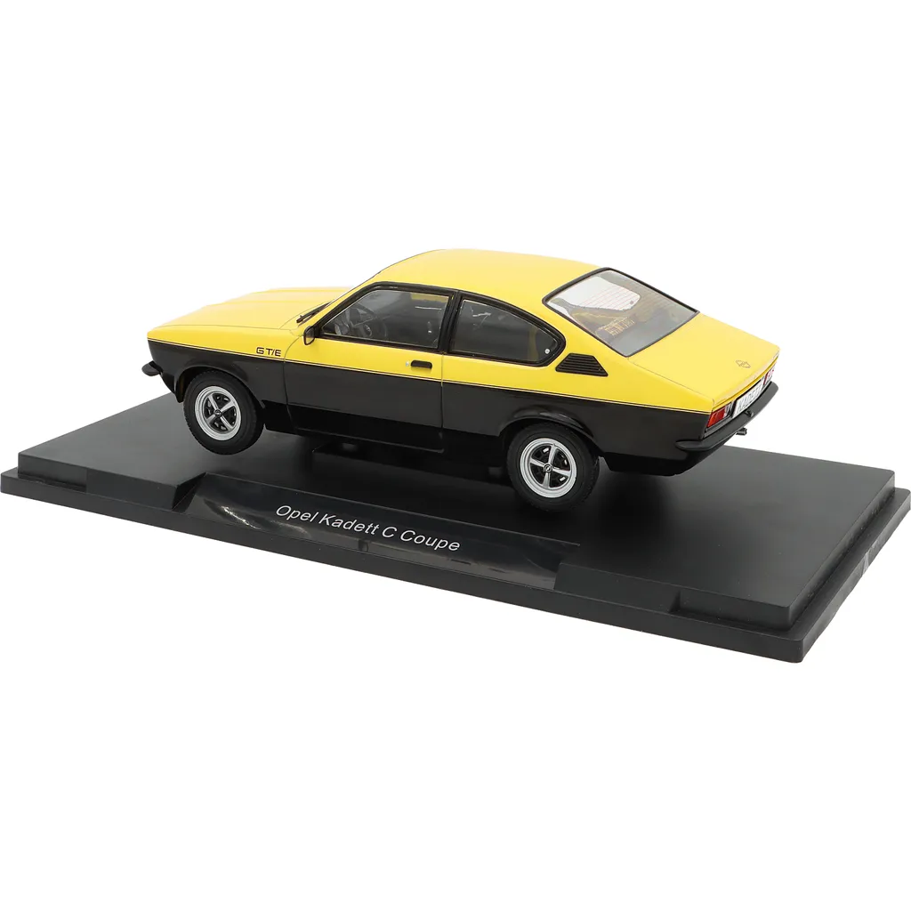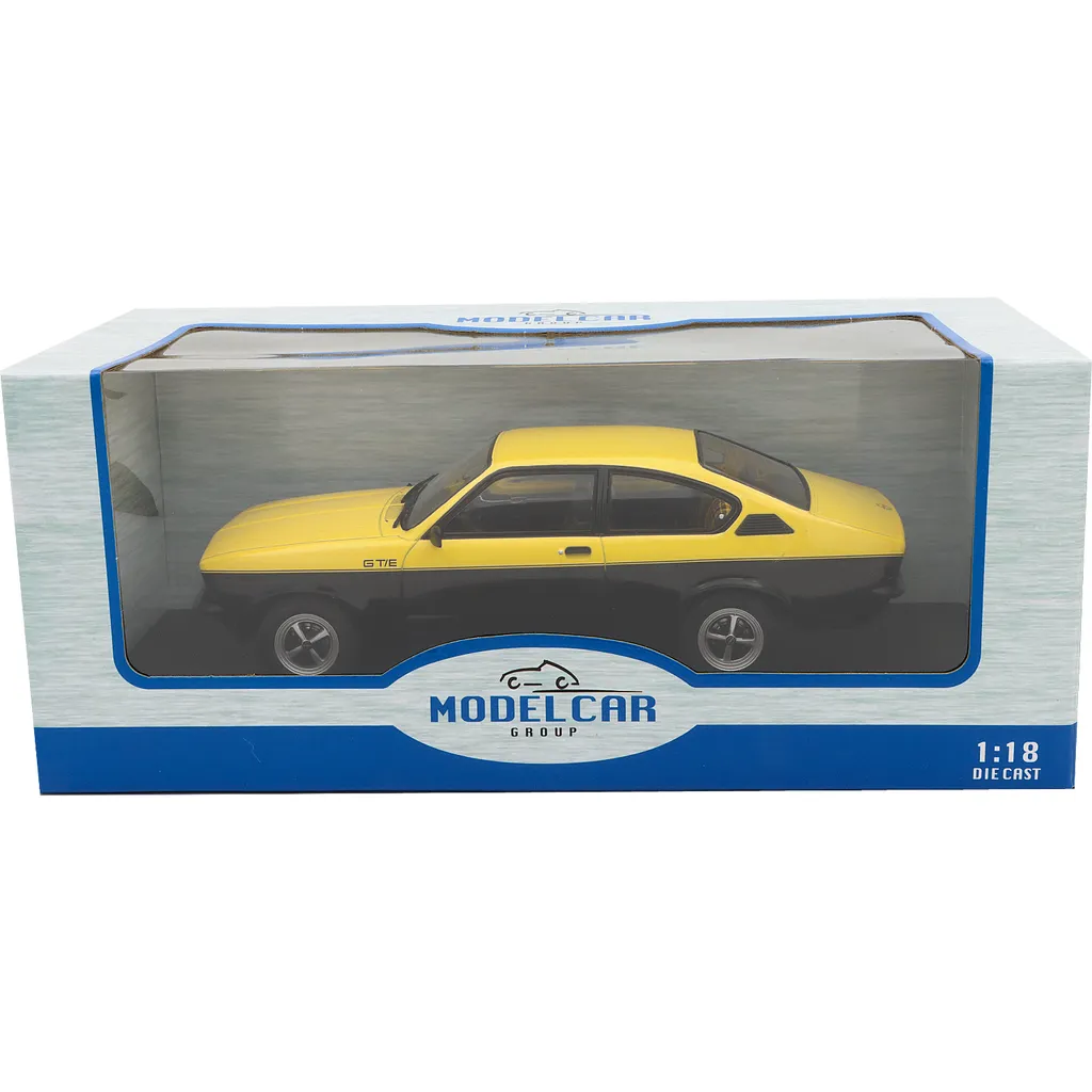 Opel Kadett C Coupé GT/E med en gul och svart lack som modellbil från Modelcar Group i skala 1:18 (längd 23 cm). Årsmodellen är 1975.