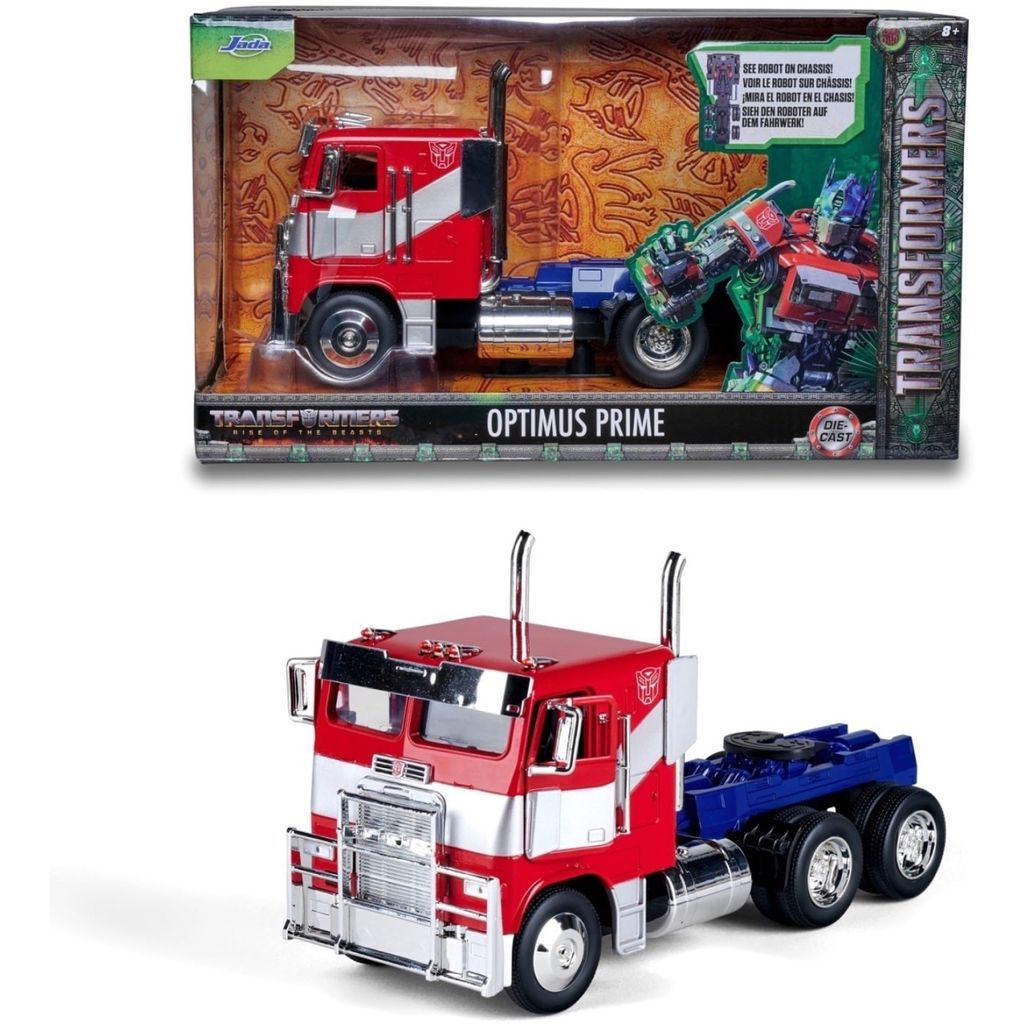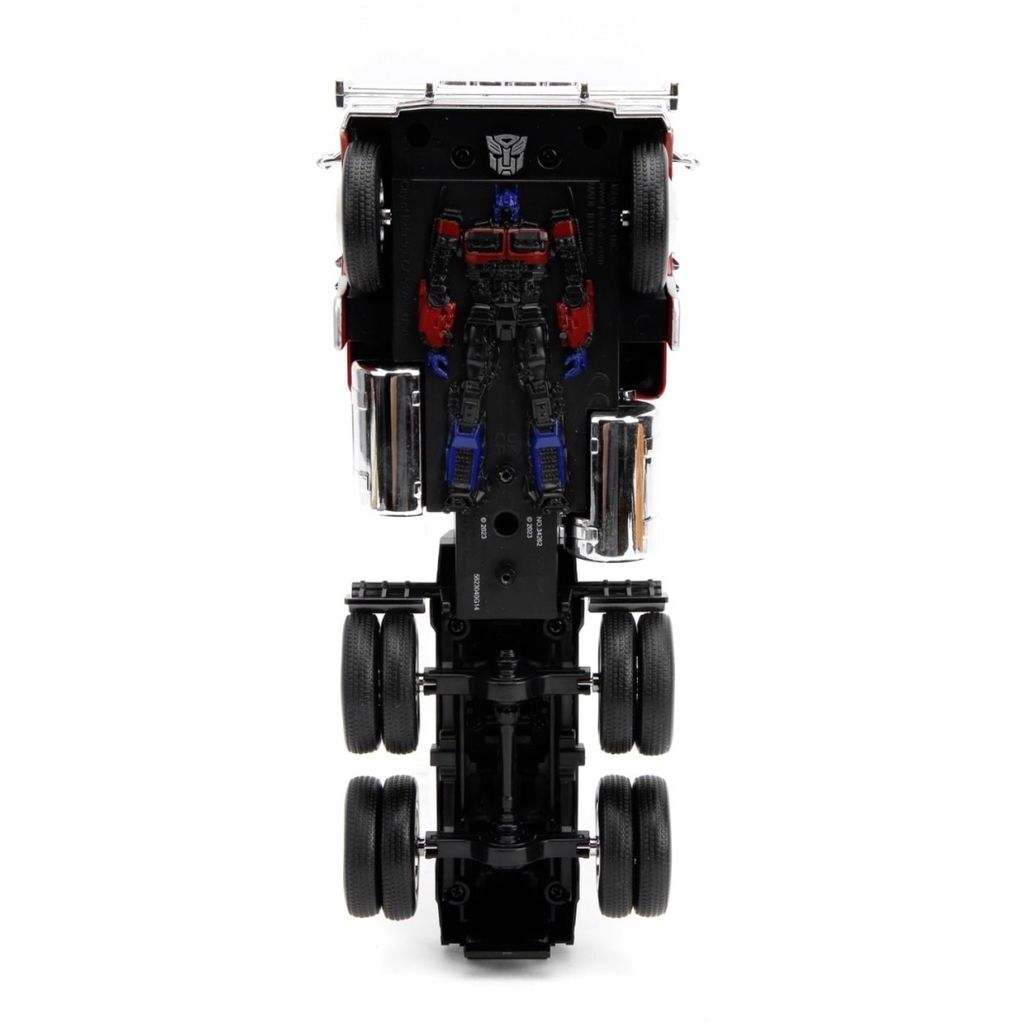 Optimus Prime från Transformers och sjunde filmen Rise of the Beasts (2023) från Jada Toys. Dragbilen / Optimus Prime är en Western Star 5700XE. Längden på trucken/dragbilen (Optimus Prime) är 24 cm.