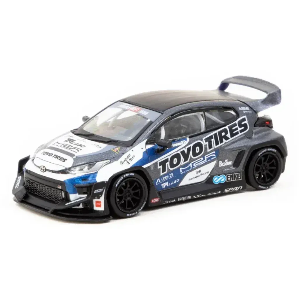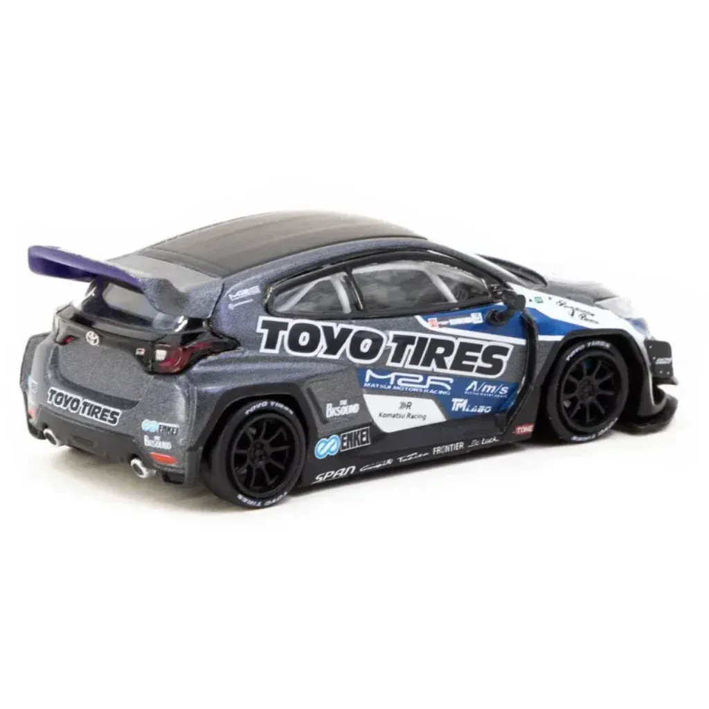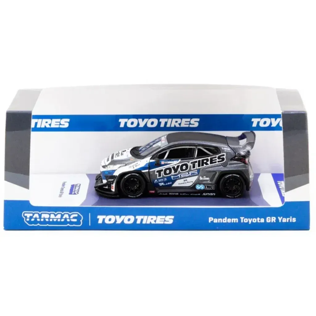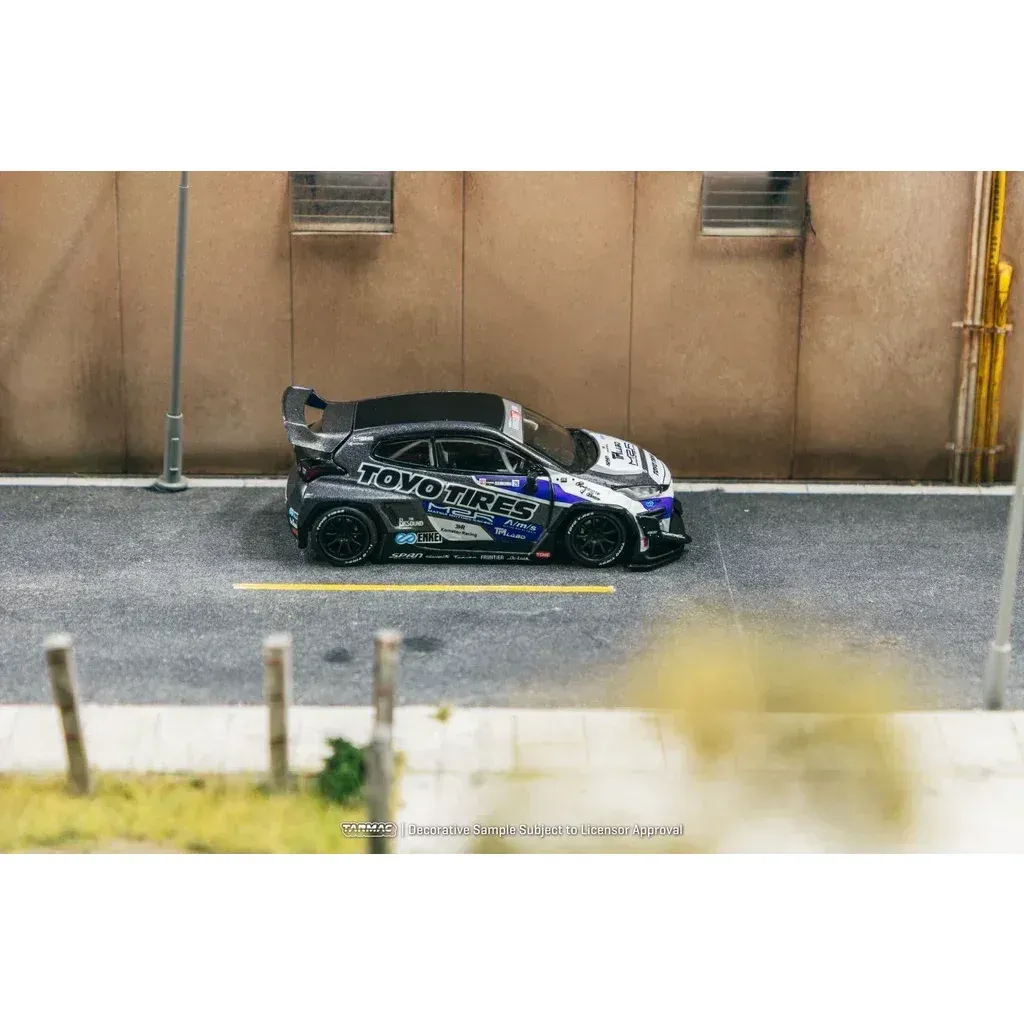Pandem Toyota GR Yaris från Tarmac Works och serien HOBBY64. Skalan är 1:64 (6,5 cm). Toyotan är gråsvart med Toyo Tires-livery.