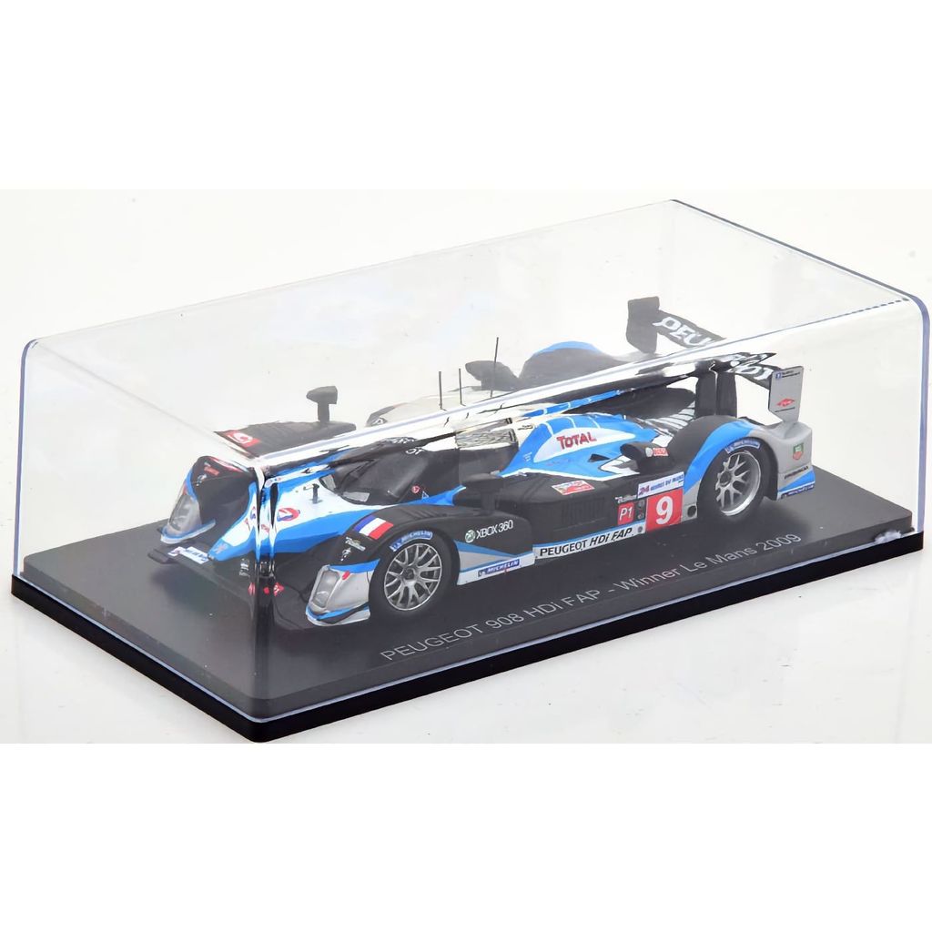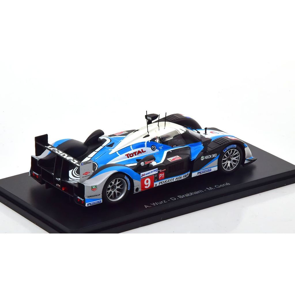 Modellbil från Spark och här i form av en Peugeot 908 HDi FAP med täckt kaross. Bilen gjorde sin debut i 24-timmarstävlingen Le Mans 2007 där Peugeot-stallet tävlade med två bilar. De följande åren var resultaten blandade och det var svårt att rå på Audi som lyckades bra i Le Mans, men 2009 slog man till fullt ut med en dubbelseger på Le Mans då bilarna kom etta och tvåa. I vinnarbilen, som denna modellbil är en modell av, turades förarna David Brabham, Marc Gené och Alexander Wurz om att vinna den klassiska racingtävlingen.