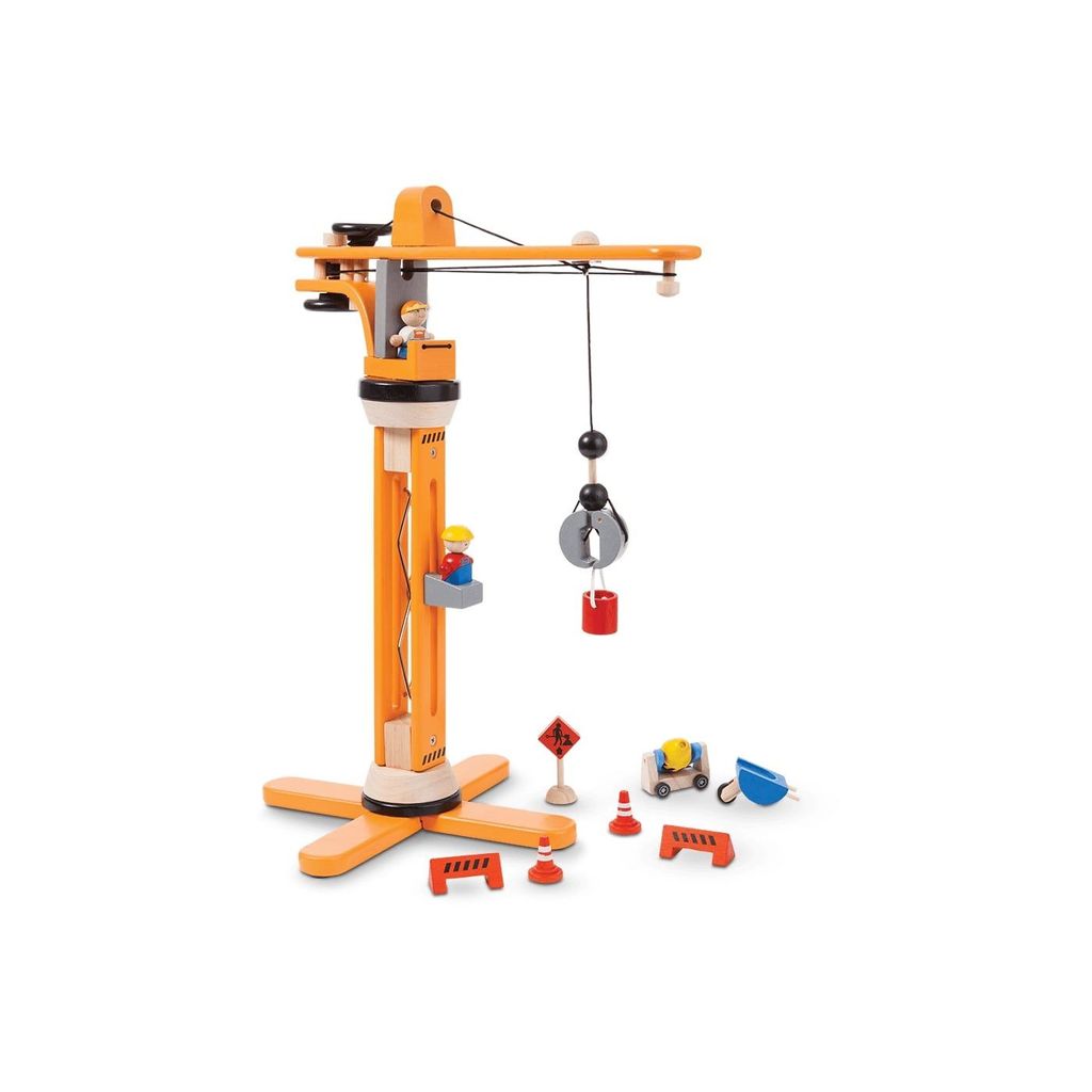 Lyftkran i trä från PlanToys med två figurer och flera tillbehör för rolig lek. Kranen kan roteras och kroken kan hissas och sänkas.