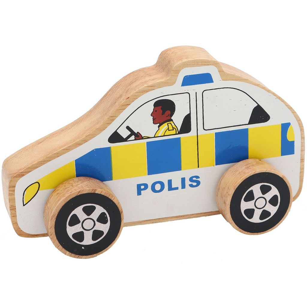 Polisbil med texten "Polis" i trä från brittiska varumärket Lanka Kade.