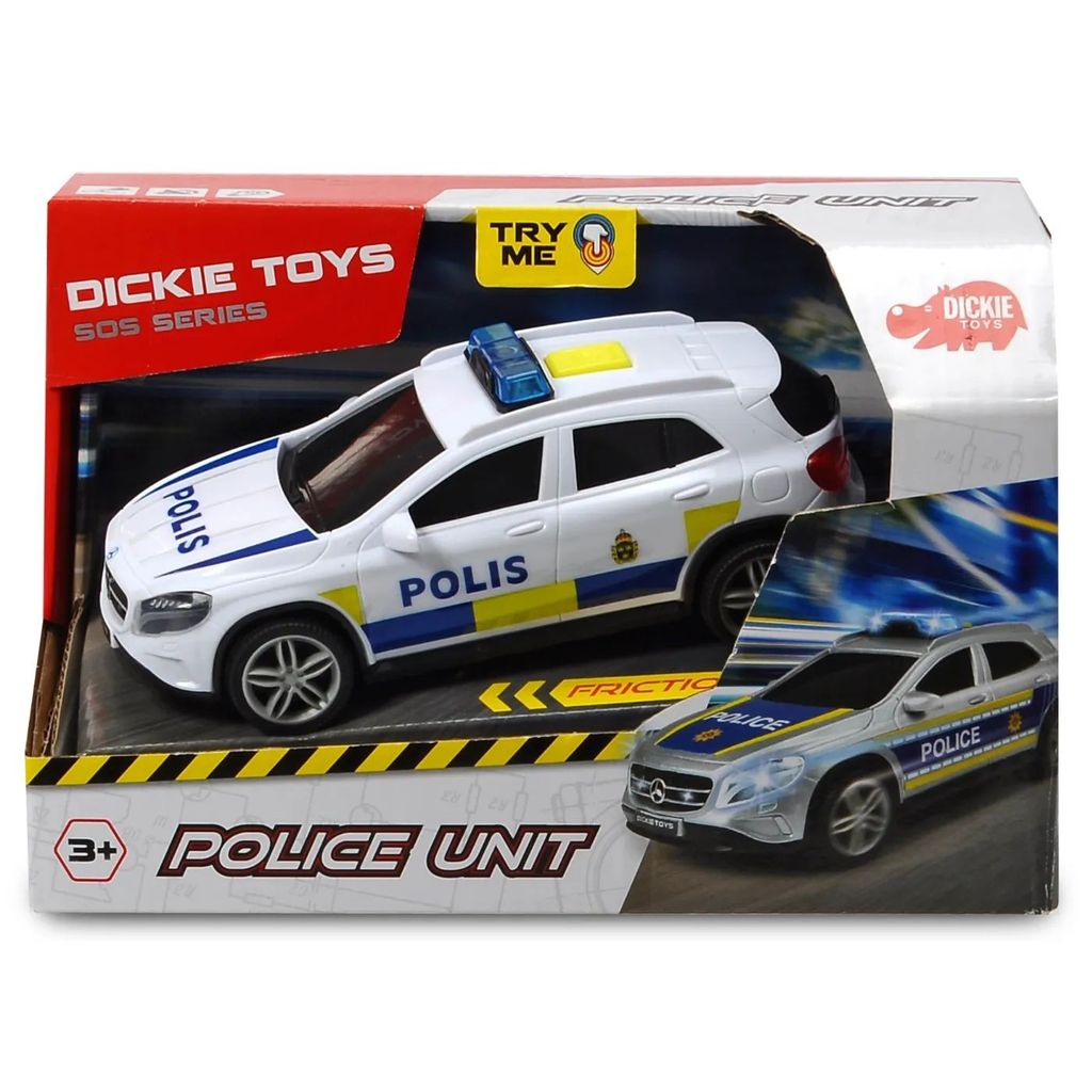 Från Dickie Toys och serien SOS Series erbjuds denna polisbil som är en Mercedes-Benz. Bilen är 15 cm lång.