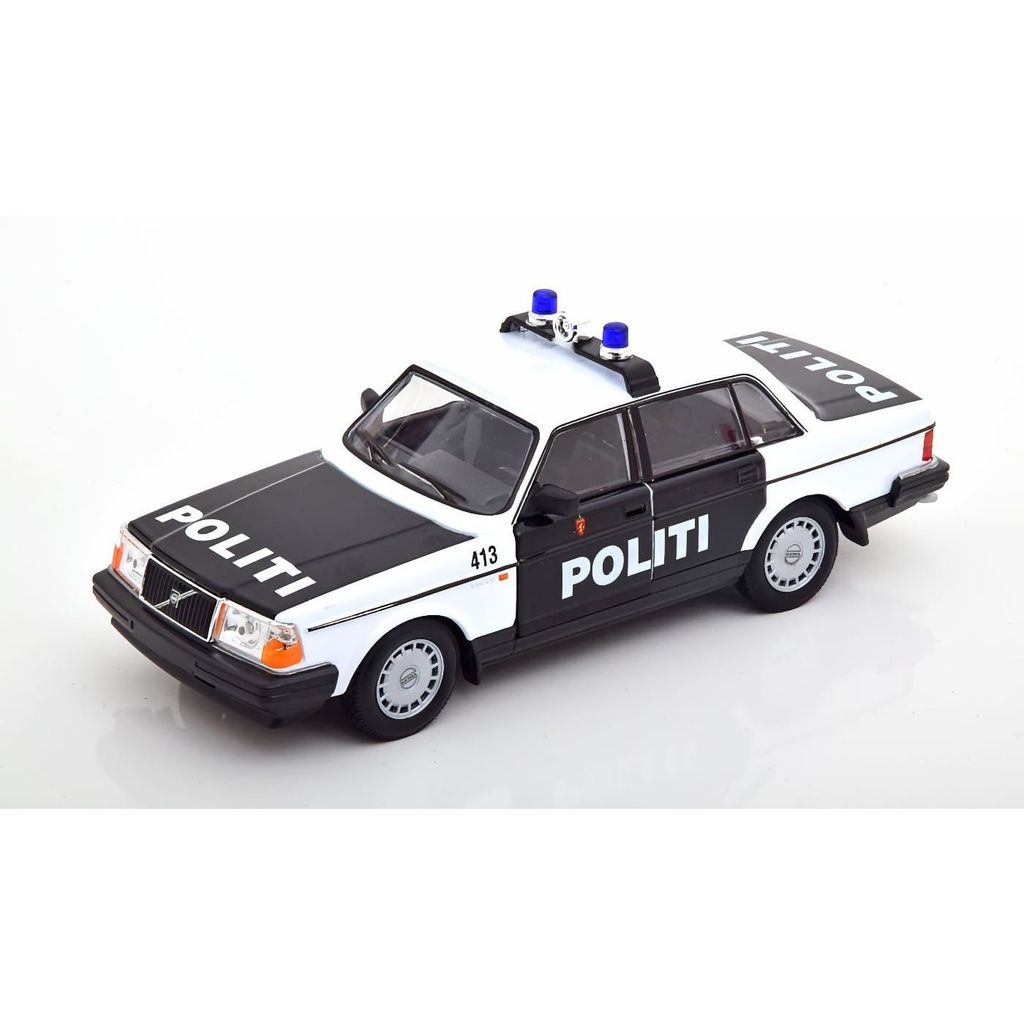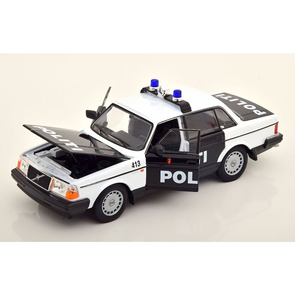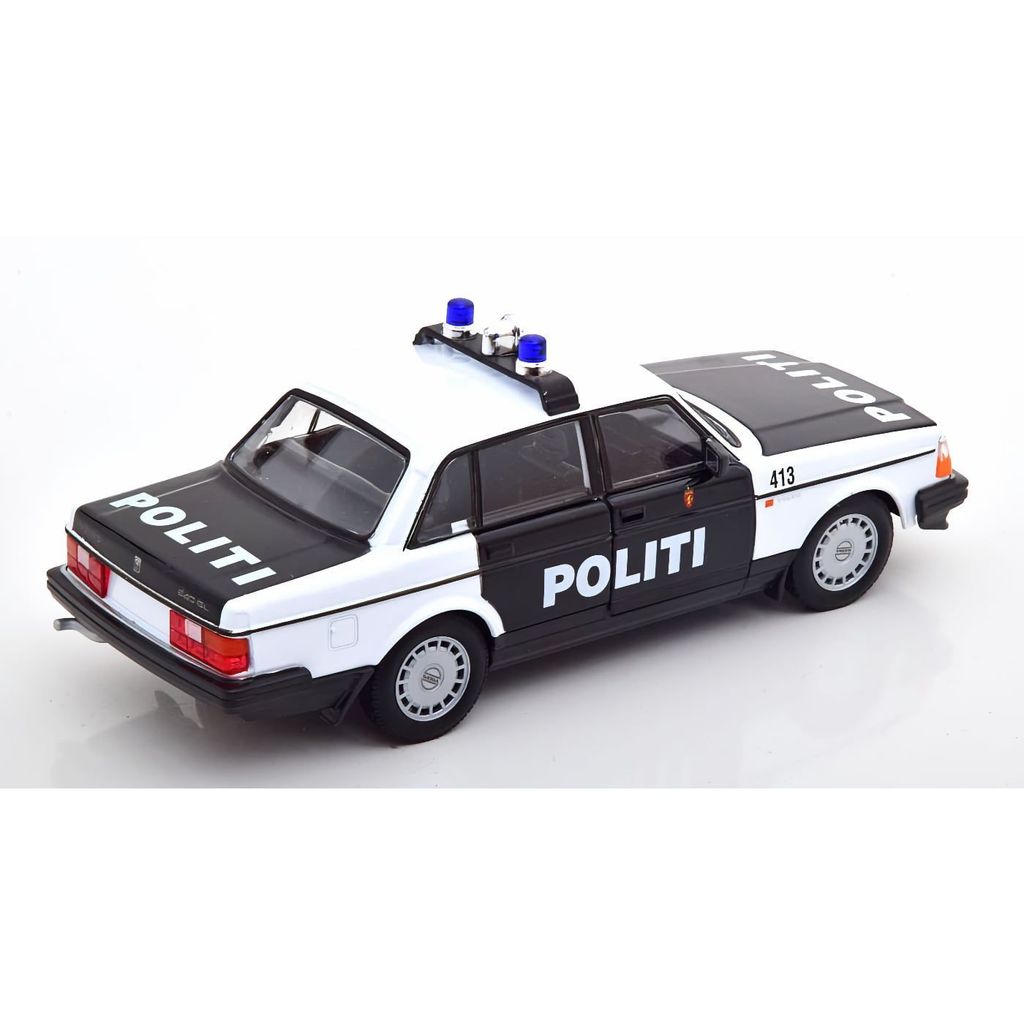 Norsk polisbil i form av en svart och vit Volvo 240 GL årsmodell 1986. Modellbilen är från tillverkaren Welly och är i skala 1:24 (längd 19 cm).