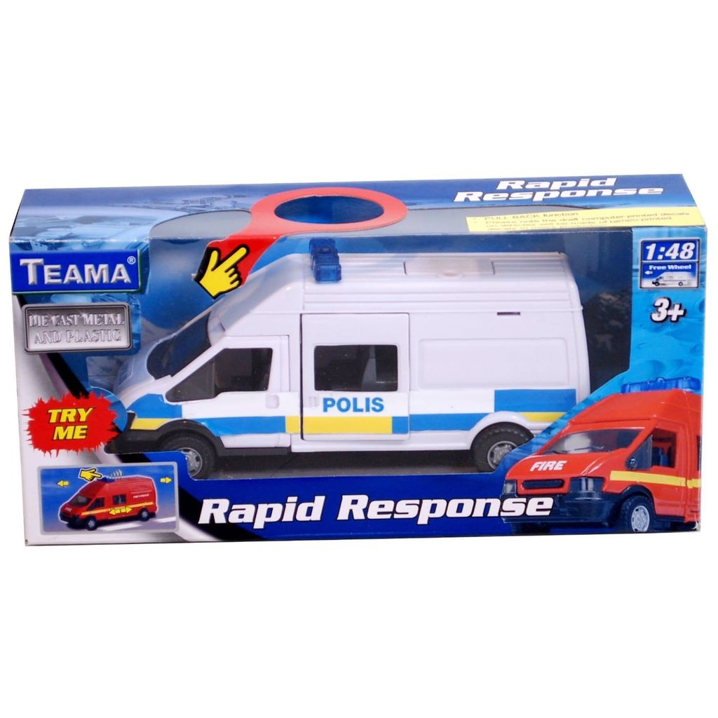 Vit svensk polisbuss med pullback/dragmotor som gör att polisbilen åker framåt efter att den dragits bakåt. Bilen är utrustad med ljud och ljus som aktiveras genom ett tryck på knappen på taket. Då startas en ljudsiren och takets blåa lampor blinkar med en röd diod under vilket ger en snygg effekt.