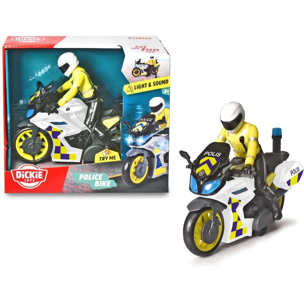 Svensk polismotorcykel från Dickie Toys med ljud och ljus. Motorcykeln har 3 blåa lampor som blinkar samt sirenljud och varningsljud som spelas upp när man trycker på knappen.
