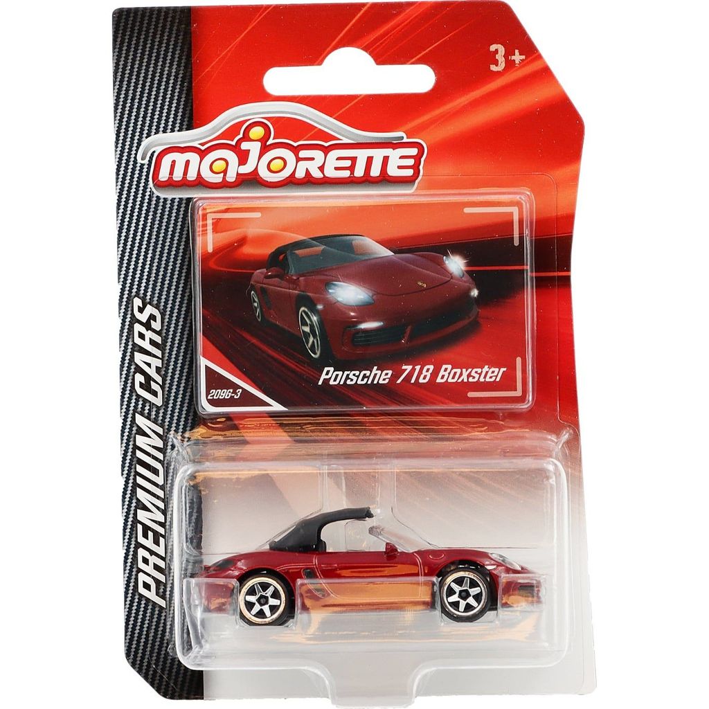 Vinröd Porsche 718 Boxster från Majorette och serien Premium Cars. Skalan är 1:58 vilket ger oss ca 7,5 cm Porsche Boxster.