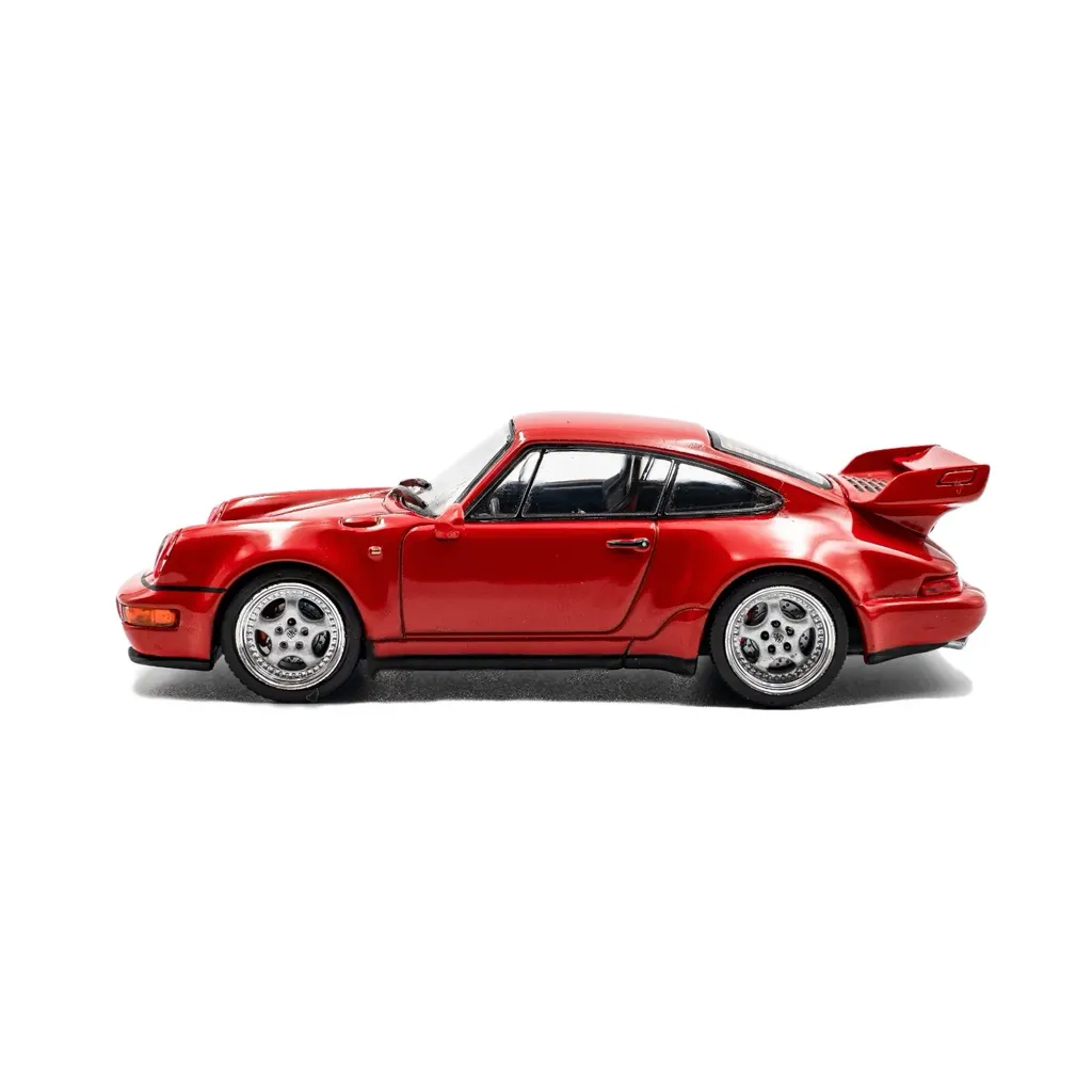 Porsche 911 (964) RS 3.8, årsmodell 1994, som modellbil från Solido i skala 1:43 (10 cm). 911:an är röd (Guards Red) med silverfärgade fälgar.