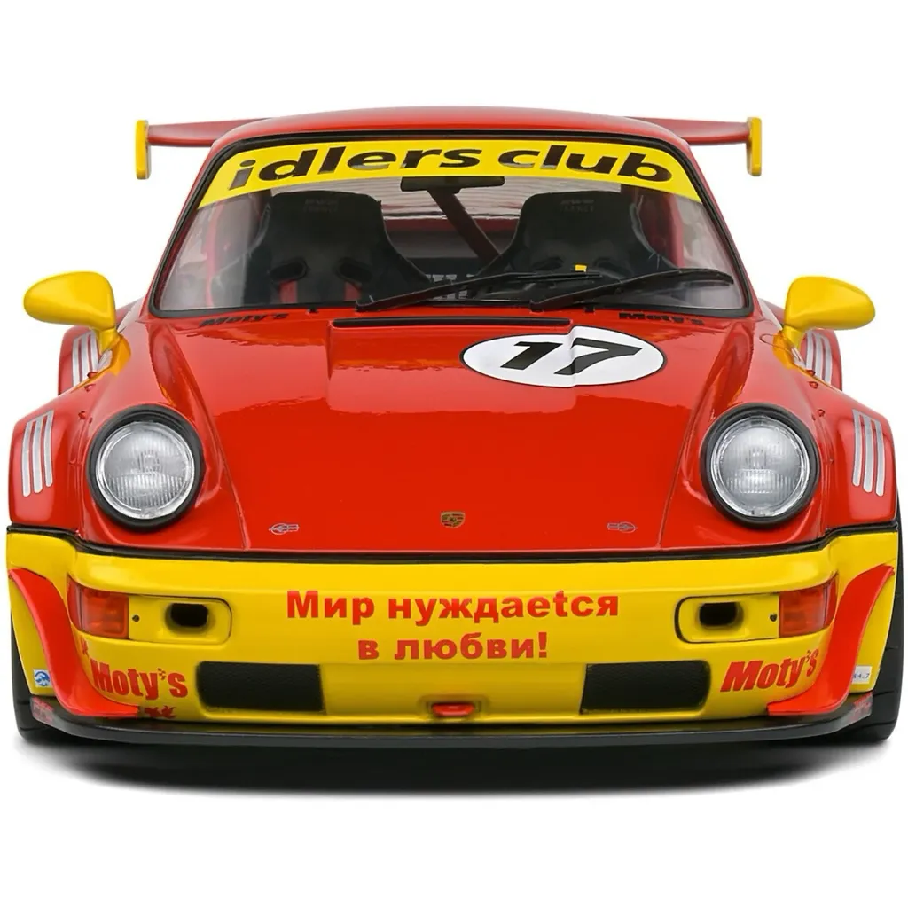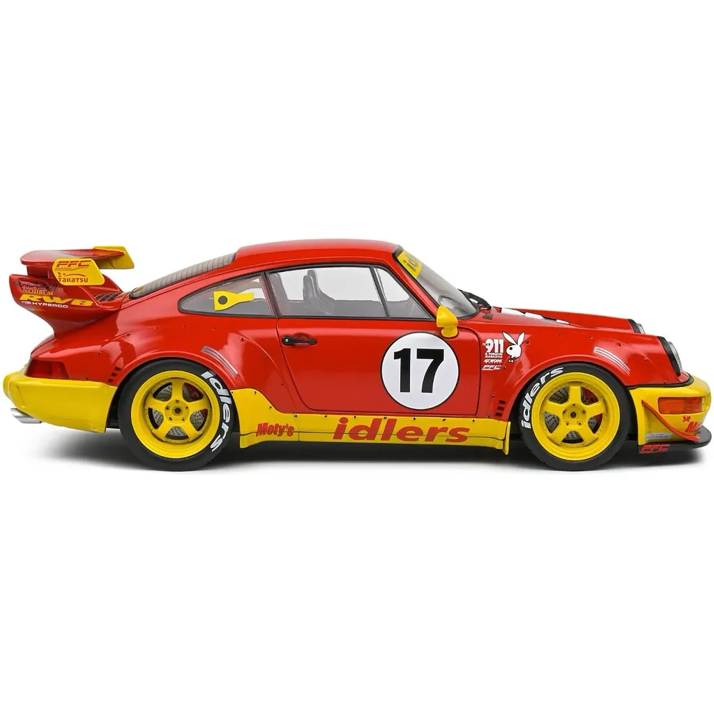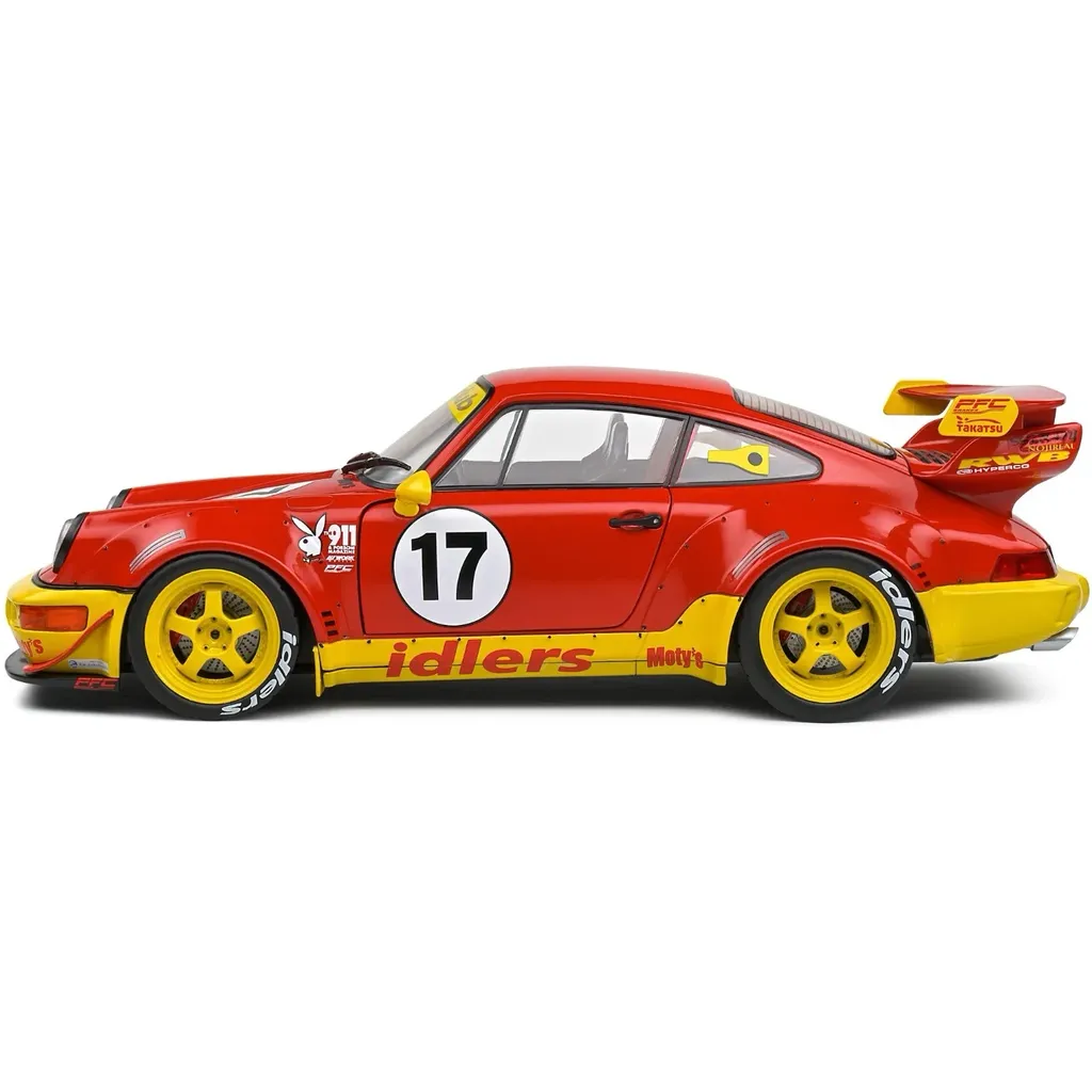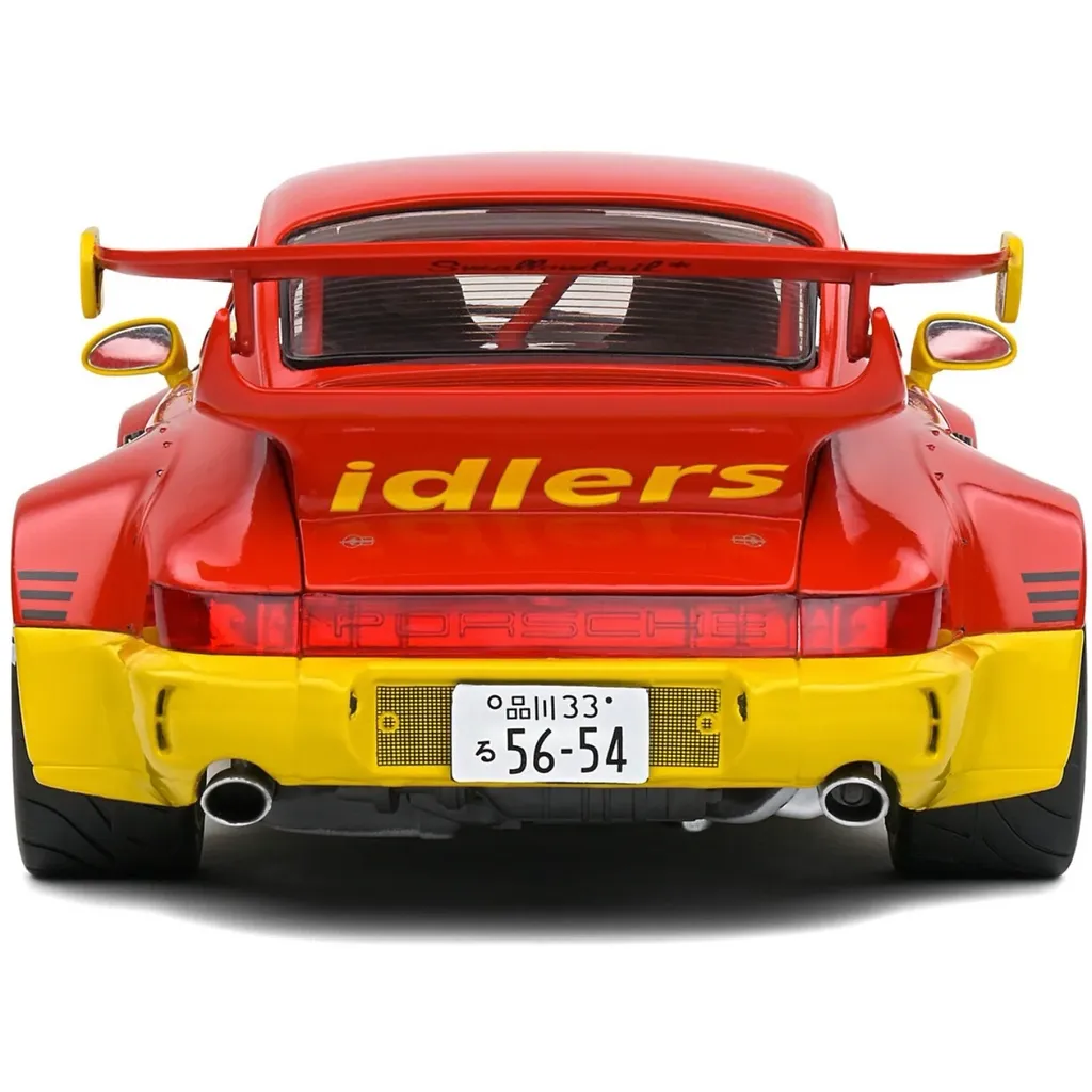 Röd och gul Porsche 911 (964) med body kit från RWB (RAUH-Welt BEGRIFF). Modellbilen är tillverkad av franska Solido i skala 1:18 (23 cm).