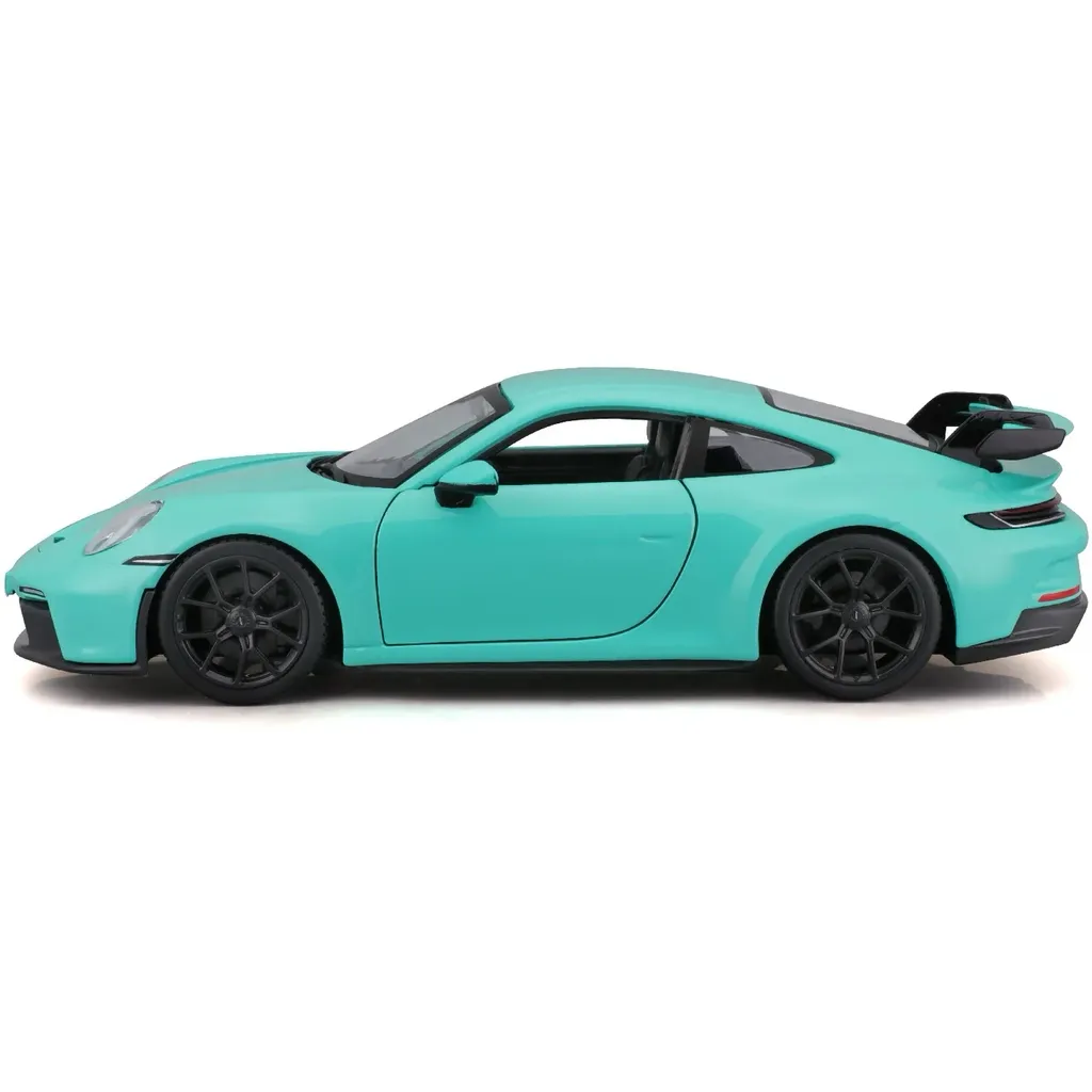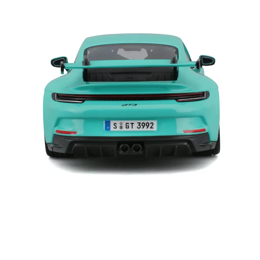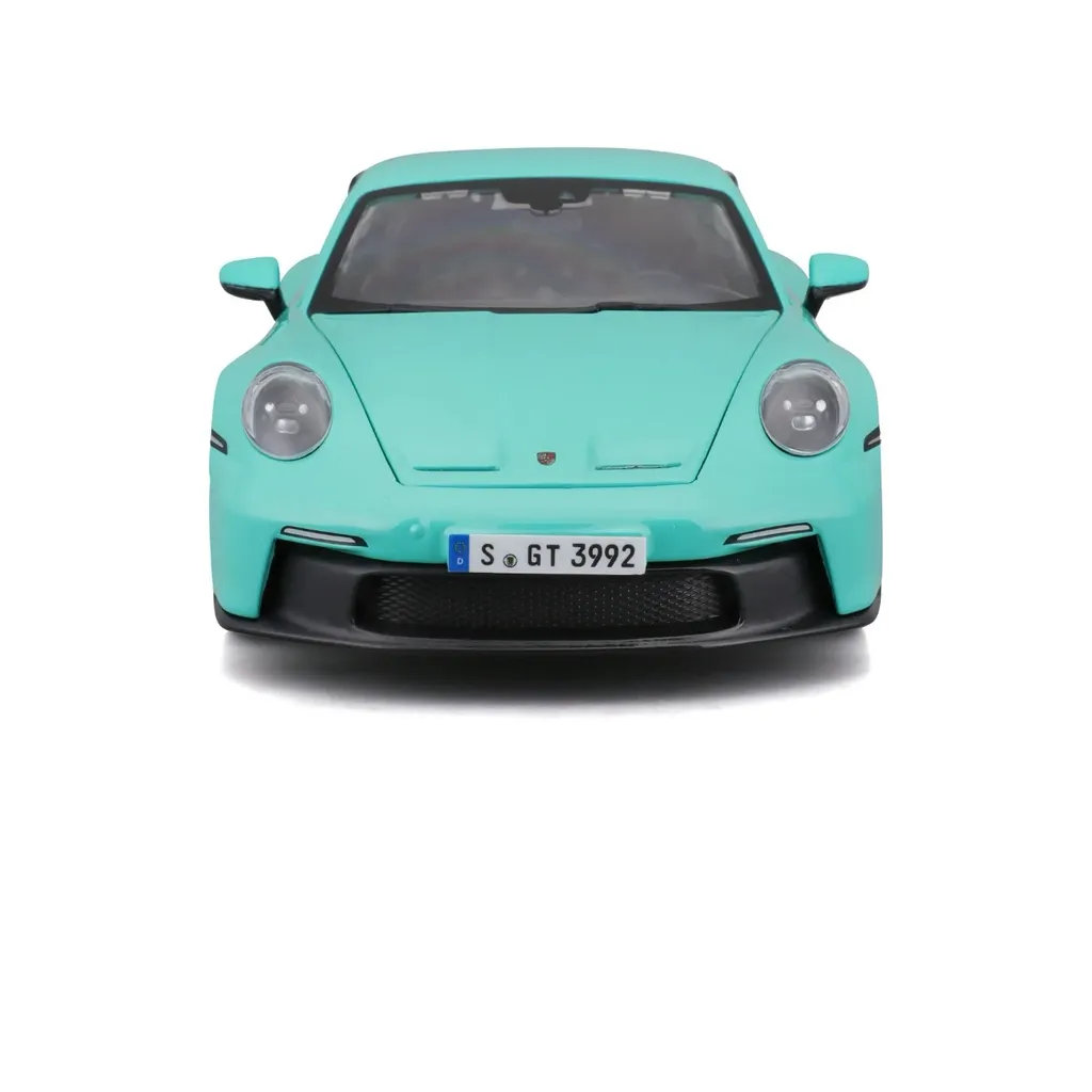 Turkos Porsche 911 (992) GT3 som leksaksmodell från Bburago. Bilen är i skala 1:24 (19 cm) och har öppningsbara dörrar.