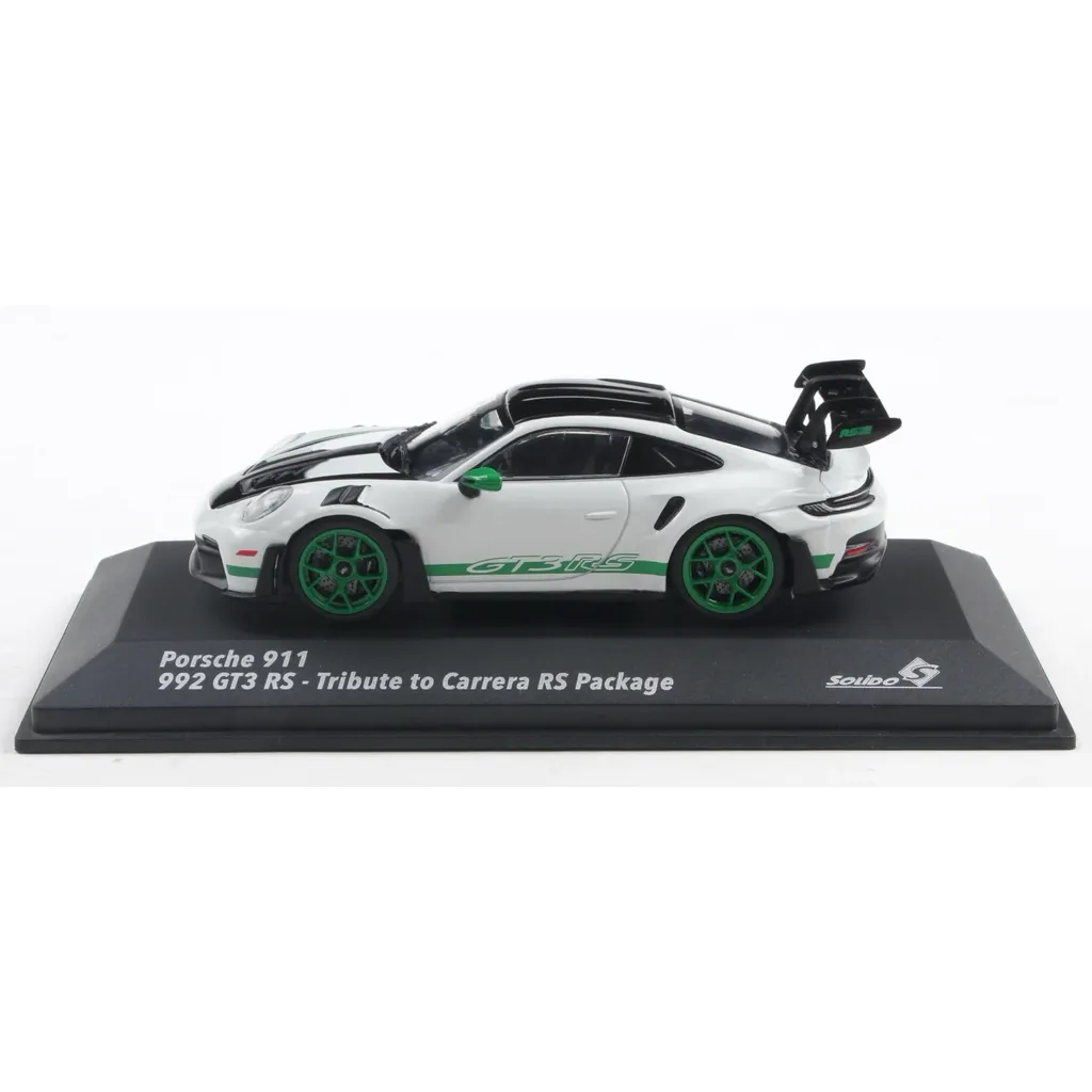 Porsche 911 (993) GT3 RS Tribute to Carrera RS Package, årsmodell 2023, som modellbil från Solido i skala 1:43 (11 cm). Porschen är vit med svarta och gröna detaljer.